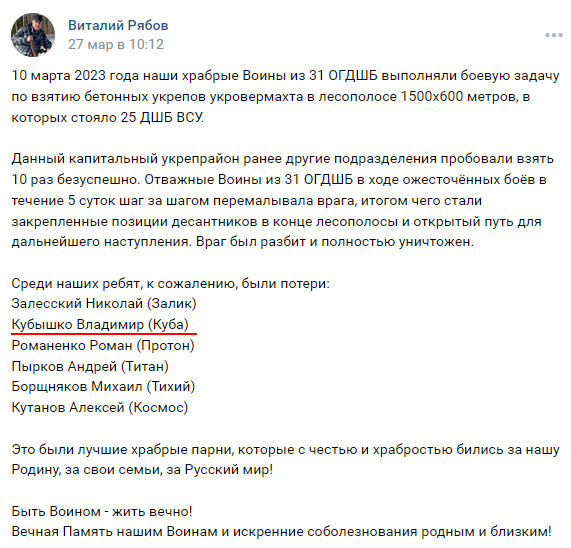 Сотрудник омского зоомагазина "Зайцы" Кубышко Владимир, 1996 г.р., по кличке "Куба" в составе #31одшбр где-то так 10-12/03/23 вышел погулять в украинскую лесополосу, встретил там охотника и .. всё!