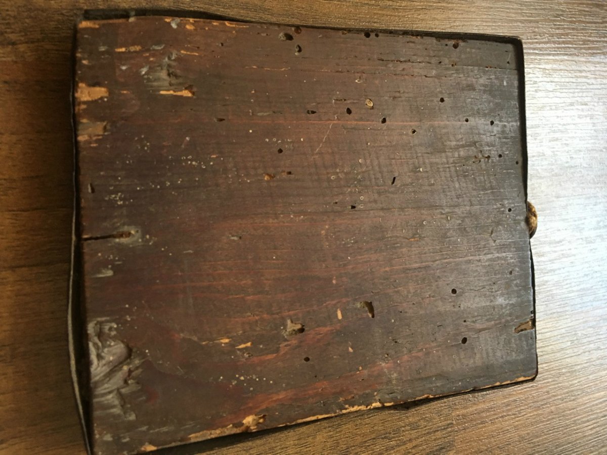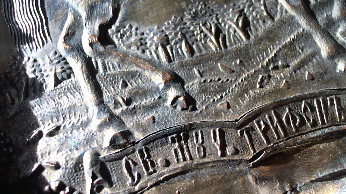 Со вспышкой поменяла цвет,вот надпись, а в начале вроде как святой а потом цифры 84? Кто может сказать каких годов икона?
