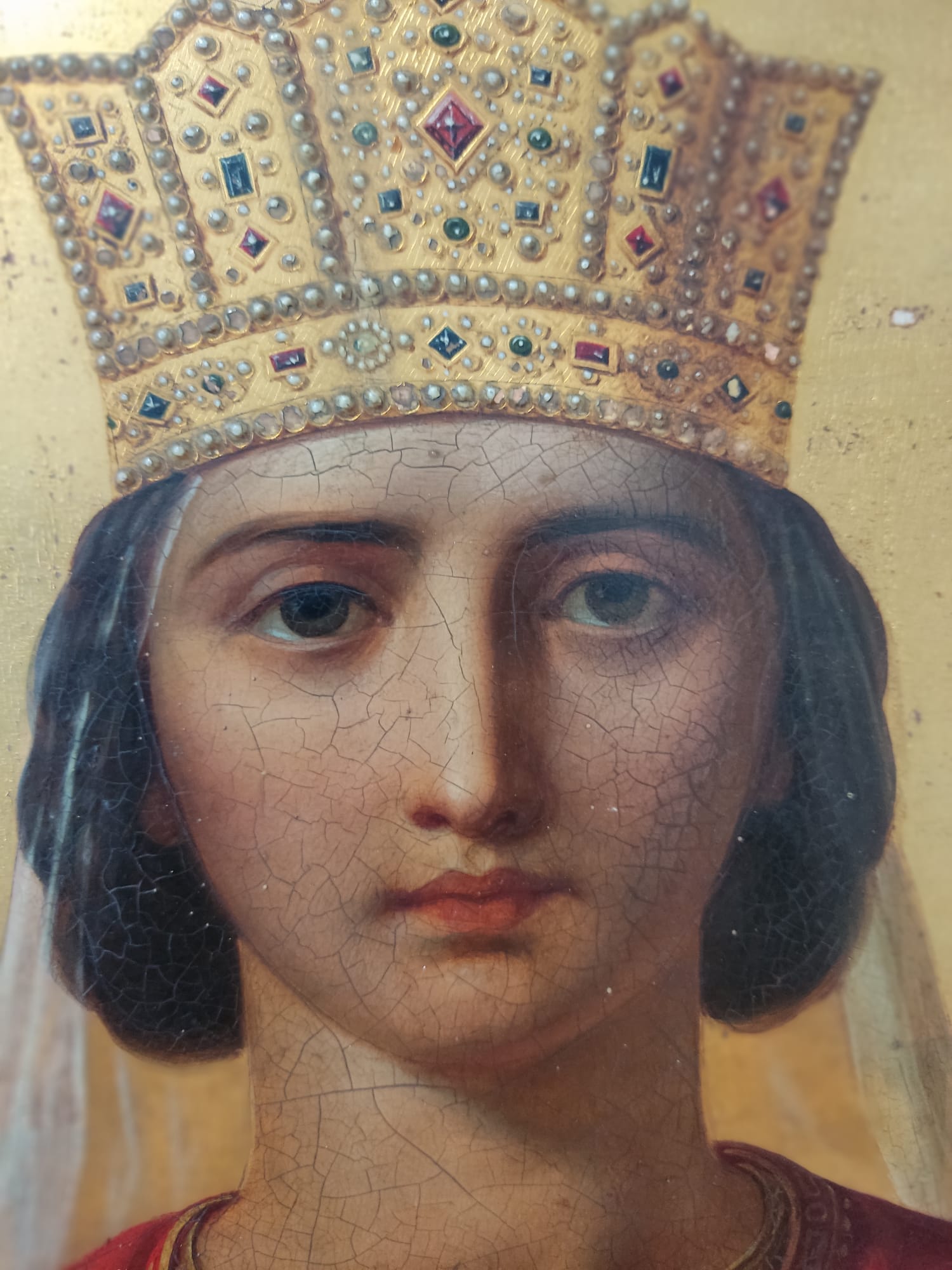Святая царица Александра. 129,5 х 59,2 см. Подпись художника «В. Васильев Санкт-Петербург» . Родился в селе Ивашково Костромской губернии. В десятилетнем возрасте его забрали в Петербург и обучали в иконописной мастерской Пешехоновых! Вместе с В.М. Пешехоновым выполнял иконо - писные заказы для храмов Москвы и Петербурга. С 1847 по 1851 год был свободным учеником Императорской Академии художеств. В 1858 году за «Живопись в византийском стиле» ему было присвоено звание академика Императорской Академии художеств. Васильев работал над росписями и иконами для храмов Москвы и Санкт-Петербурга, а также заказами для православных храмов в Польше, Италии и Франции. Его религиозные картины сочетали реализм академической живописи со строгостью византийской иконографии. Писал иконы для церквей Петербурга и окрестностей, а также для православных храмов Ниццы, Варшавы и Флоренции. Его икону Святой Александры 1858 года можно увидеть в Государственной Третьяковской галерее.