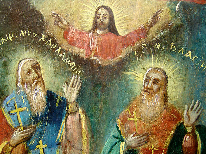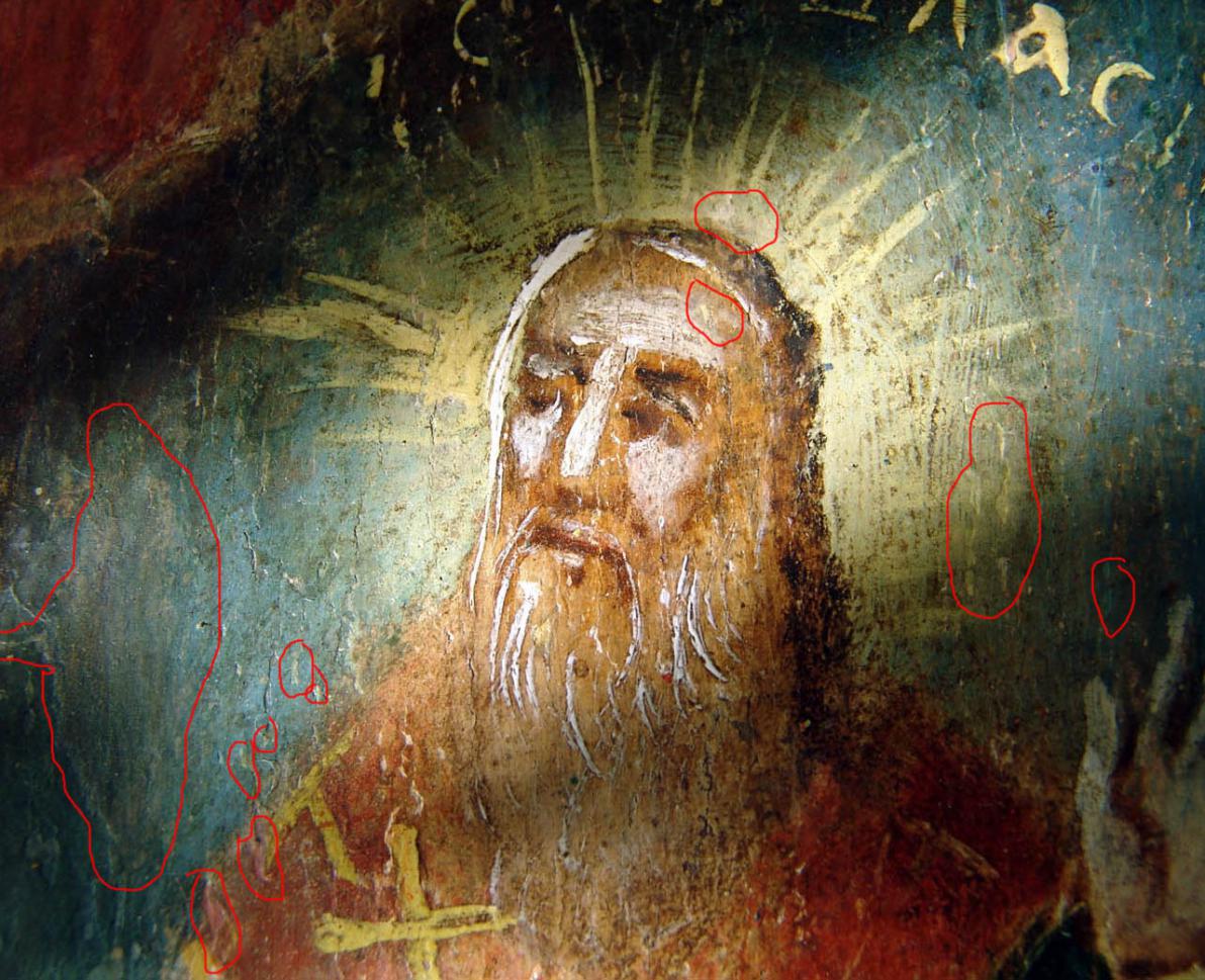 Да, скорей всего, икона действительно поновлялась, но очень давно, поскольку все "обновки" были покрыты приличным слоем копоти и грязи. Фотография, к сожалению, не передает фактуру поверхности. Визуально на ней отчетливо видны белые пастозные мазки на ликах, а так же подведена окантовка одежд святых и окаймляющая красная рамка. Эти мазки контрастируют своей фактурностью на гладкой почти глянцевой поверхности остального изображения.
