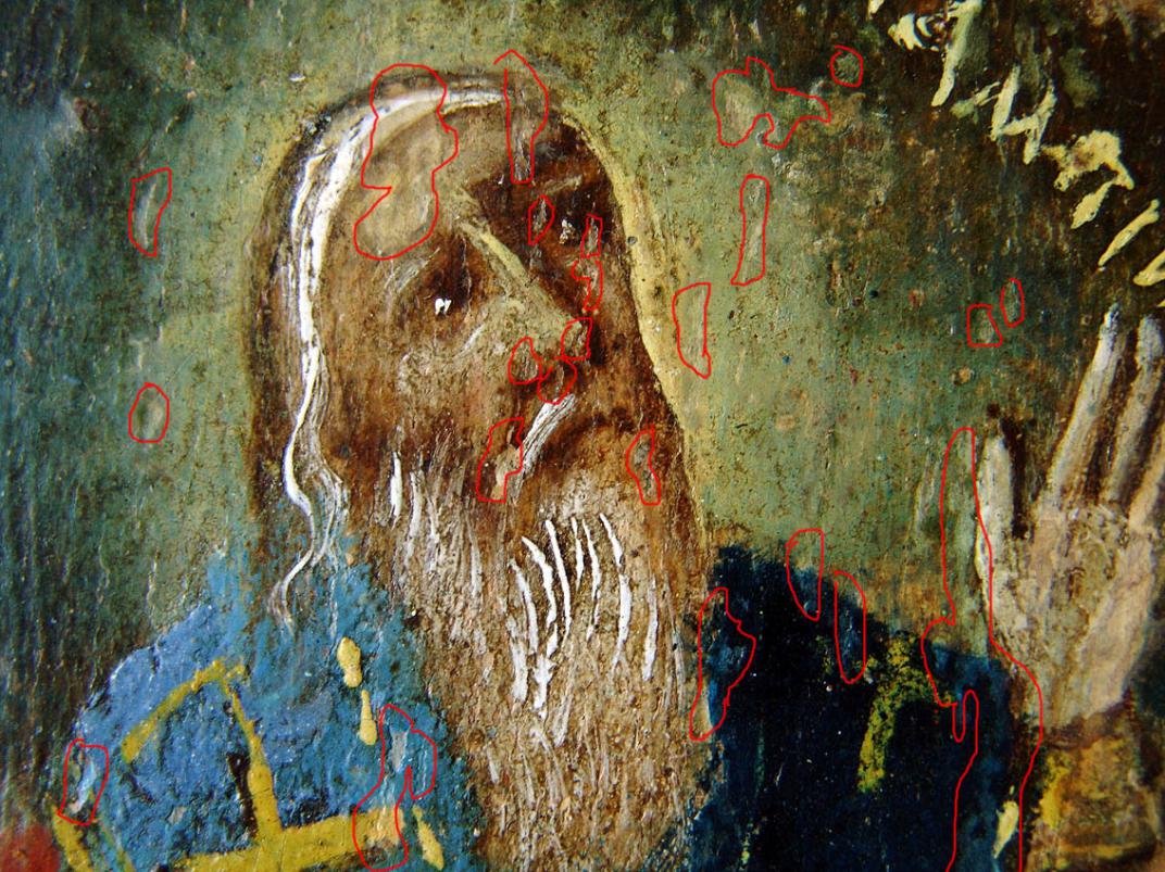 Моя позиция: если, к примеру, утрачен лик – следует не воссоздать, а ограничится тем, что затонировать под окружащий фон полупрозрачным слоем исключительно с тем, чтобы не зияло бельмом и не мешало общему восприятию картины и т. п.