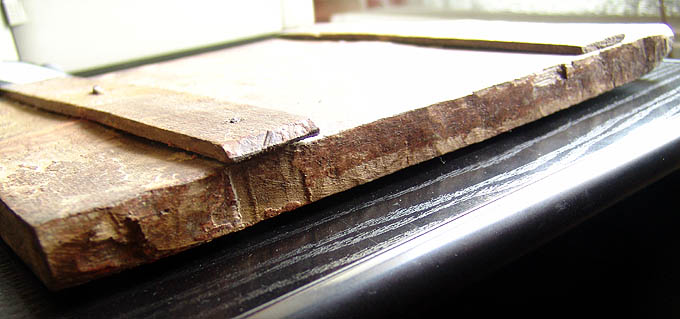 Ведь те накладные шпонки которые присутствуют, скорей всего, были прибиты гораздо позже, чтоб скрепить расколовшуюся доску. Сама доска (то ли из липы, то ли из клена, но точно не сосна) изначально была цельно выструганной, округлой формы в сечении и без следов от врезки шпонок.