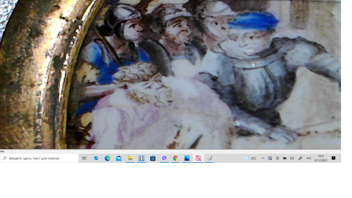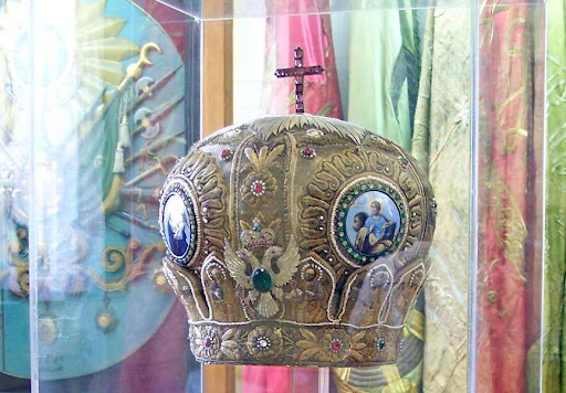 вітаю. сюжет, на мою думку - Хрестний шлях Ісуса. на задньому плані Симон Киринеянин (?). медальйон з таким сюжетом не розмістили б на митрі - там в основному Ісус, Богородиця, Іоанн Хреститель, Хрест. на Евангелії Евангелісти та Ісус. можливо це щось інше. імхо.