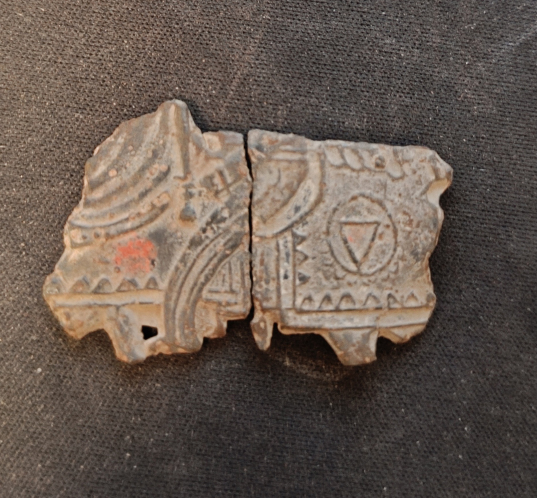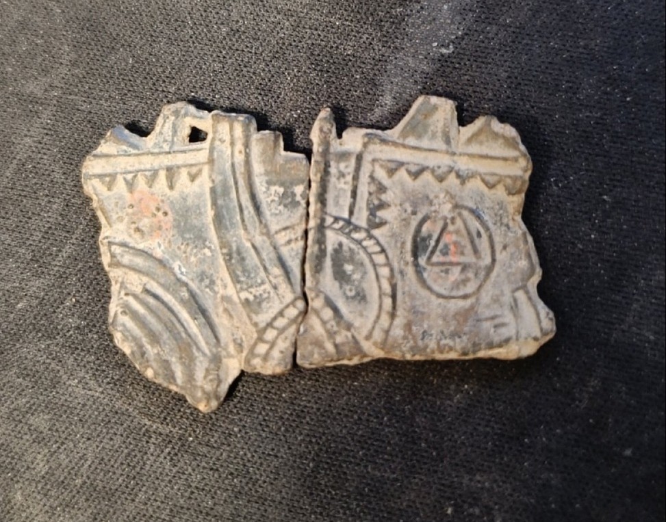 Доброго времени суток. Помогите определить что было изображено. Какая примерно культура и период. На первой фотке вроде бы видно меч в руке. И что это может быть за знак (треугольник в круге)? Найдено возле церкви 16век.
