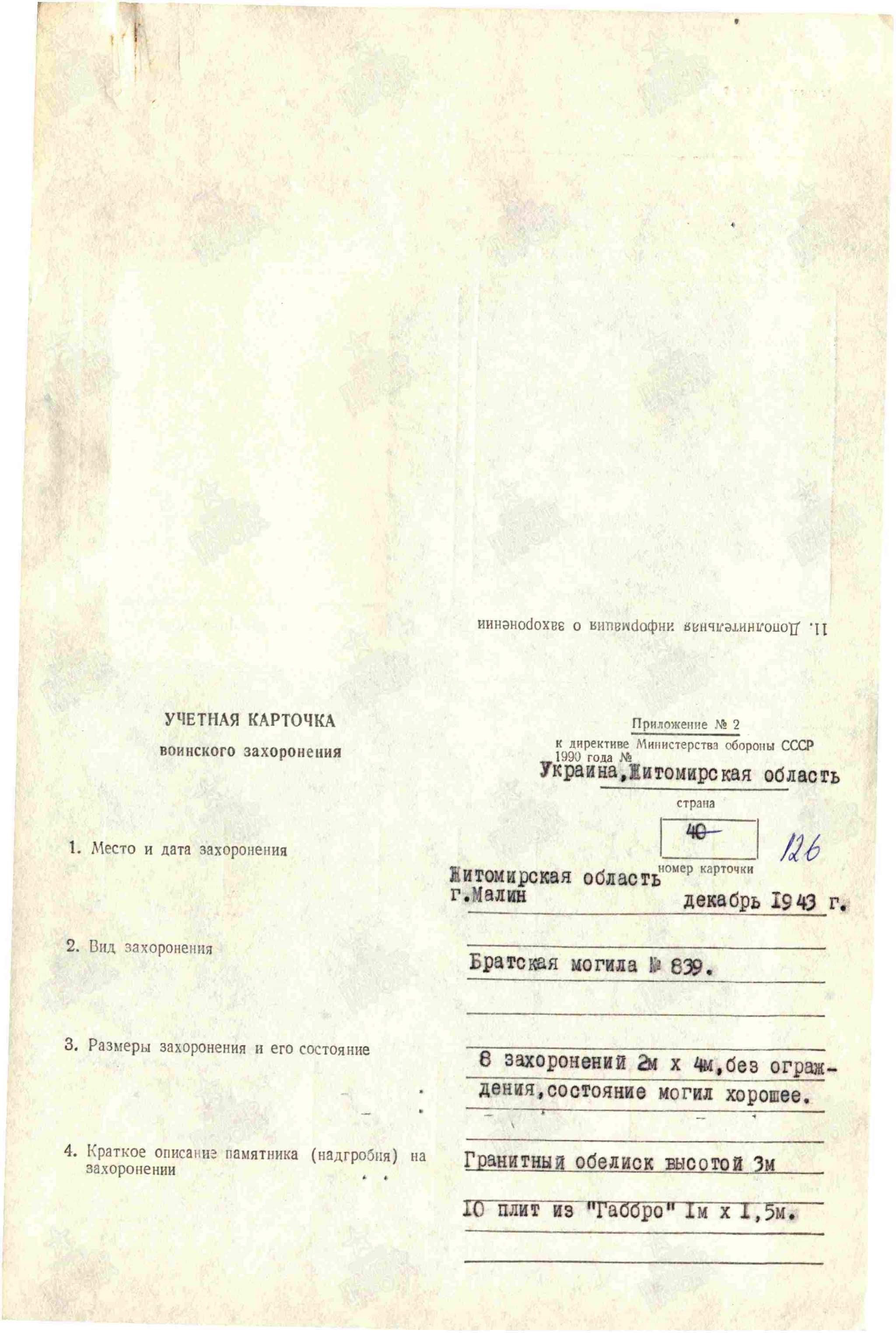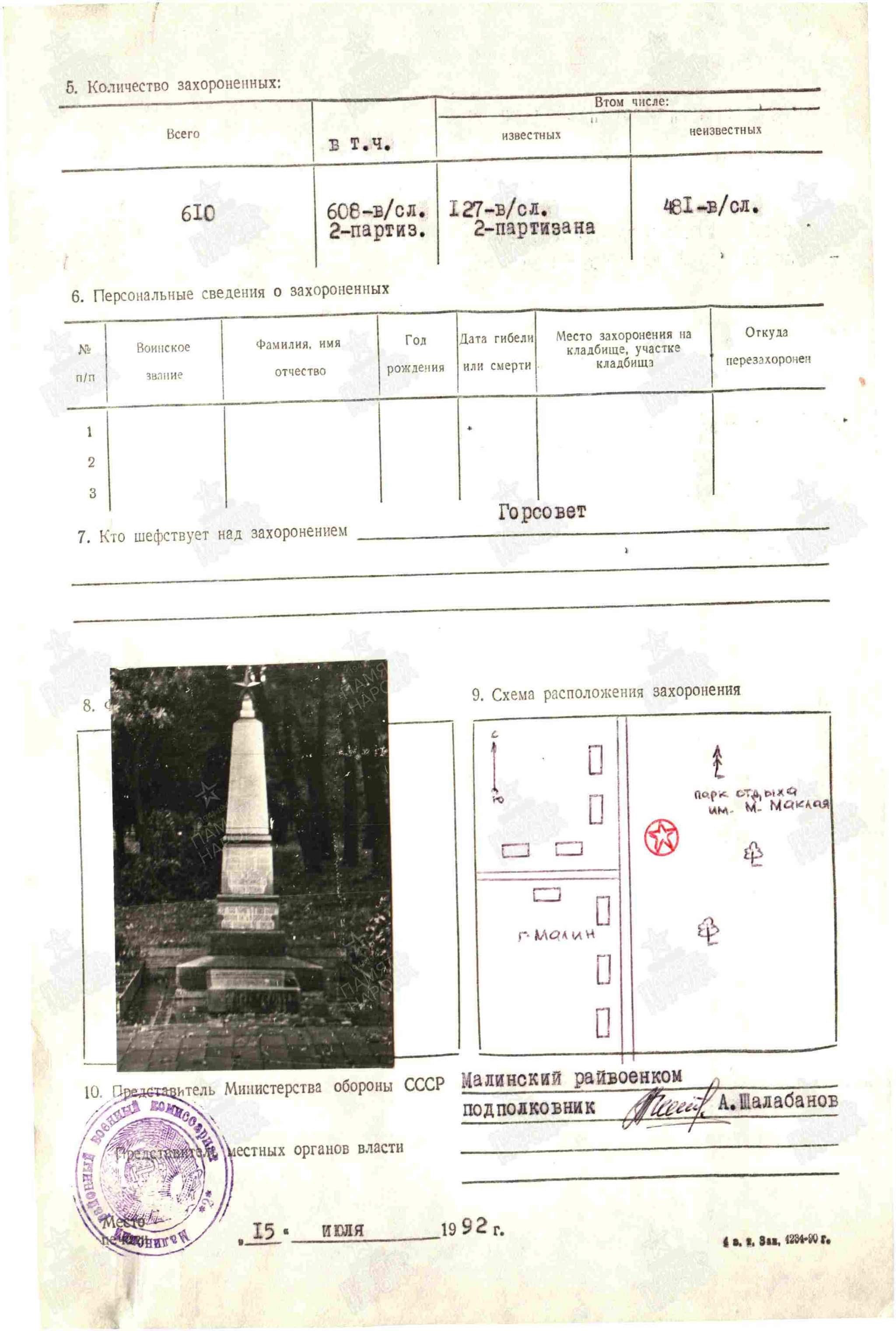 Ларчик открывается просто. Есть бюст Бармина возле братки, на братке выбиты ФИО ещё 128 бойцов . В 1990-1992 годах РВК еще СССР проводили паспортизацию захоронений. Сотрудник военкомата, выполнявший задание, пробежался и переписал данные на братке. Рядом стоит бюст с ФИО ГСС Бармина, его тоже записали в список паспорта 1992 года. Так Бармин в ОБД попал в "захороненные" в Малине. Выясняйте по какой причине и когда этот бюст поставили? официально он был - пропал без вести Фамилия Бармин Имя Илья Отчество Елизарович Дата рождения/Возраст __.__.1916 Место рождения Тамбовская обл., Каменский р-н, д. Репное Дата и место призыва Воловский РВК, Тульская обл., Воловский р-н Последнее место службы 14 гв. тбр 4 гв. тк Воинское звание гв. капитан Причина выбытия пропал без вести Дата выбытия 10.12.1943 Место выбытия Украинская ССР, Житомирская обл., Малинский р-н, г. Малин, южнее https://obd-memorial.ru/html/info.htm?id=3947093 его потом искала в 1944 семья и им дали официальный окончательный ответ на основании приказа МО СССР