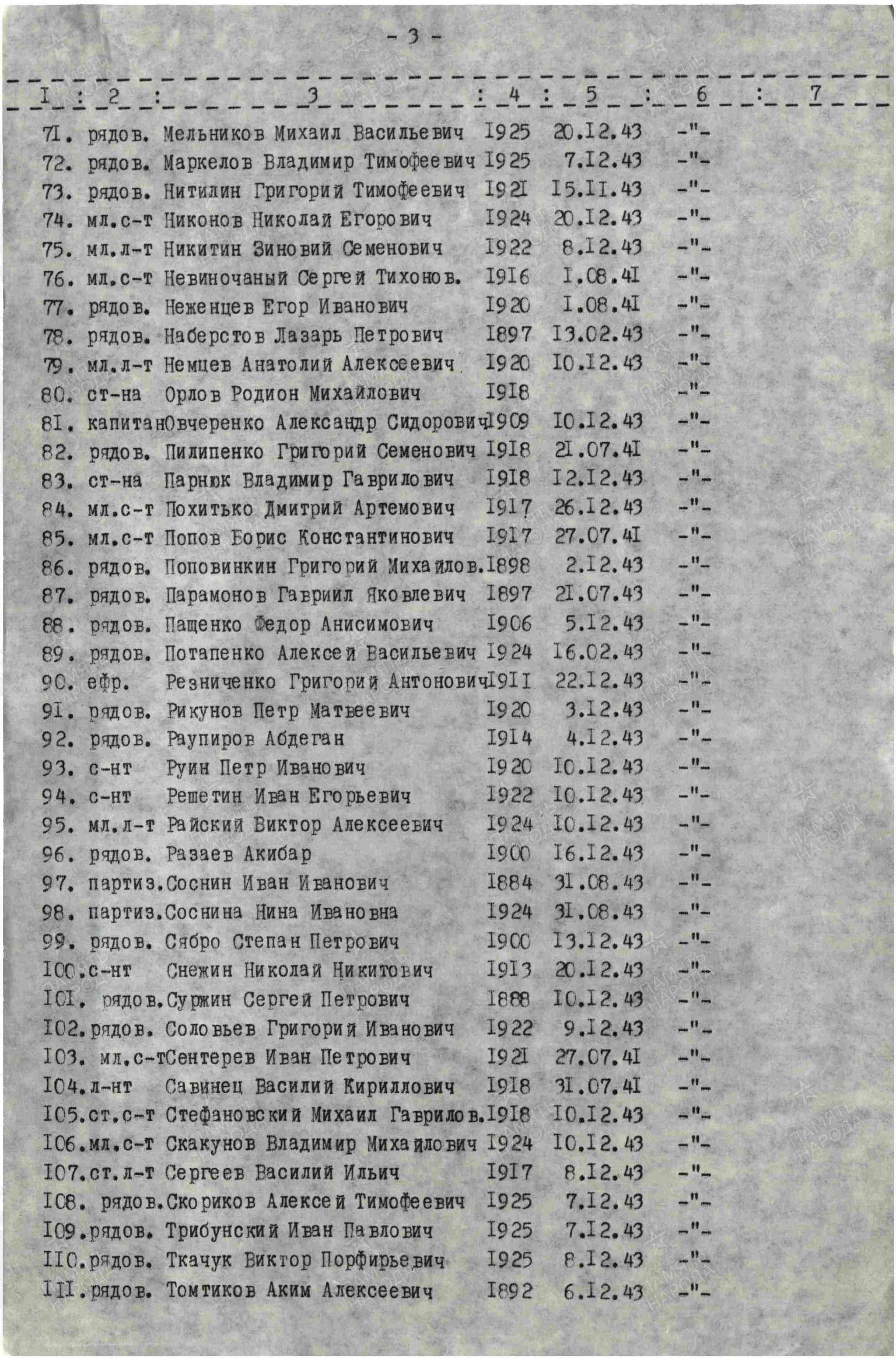 Ту тему я помню, там отписывался. Но по ОБД на братках в Житомирской нет увековеченных Денисовых А.В. с такими данными, тем более в Улашановке. Того я и отстаиваю свою гепотизу, что на увековечивание пропавший безвести не попадет никак. Только может в редком уникальном случае когда РВК натупили при составлении паспортов захоронений или карточек на увековечивание в 1965.