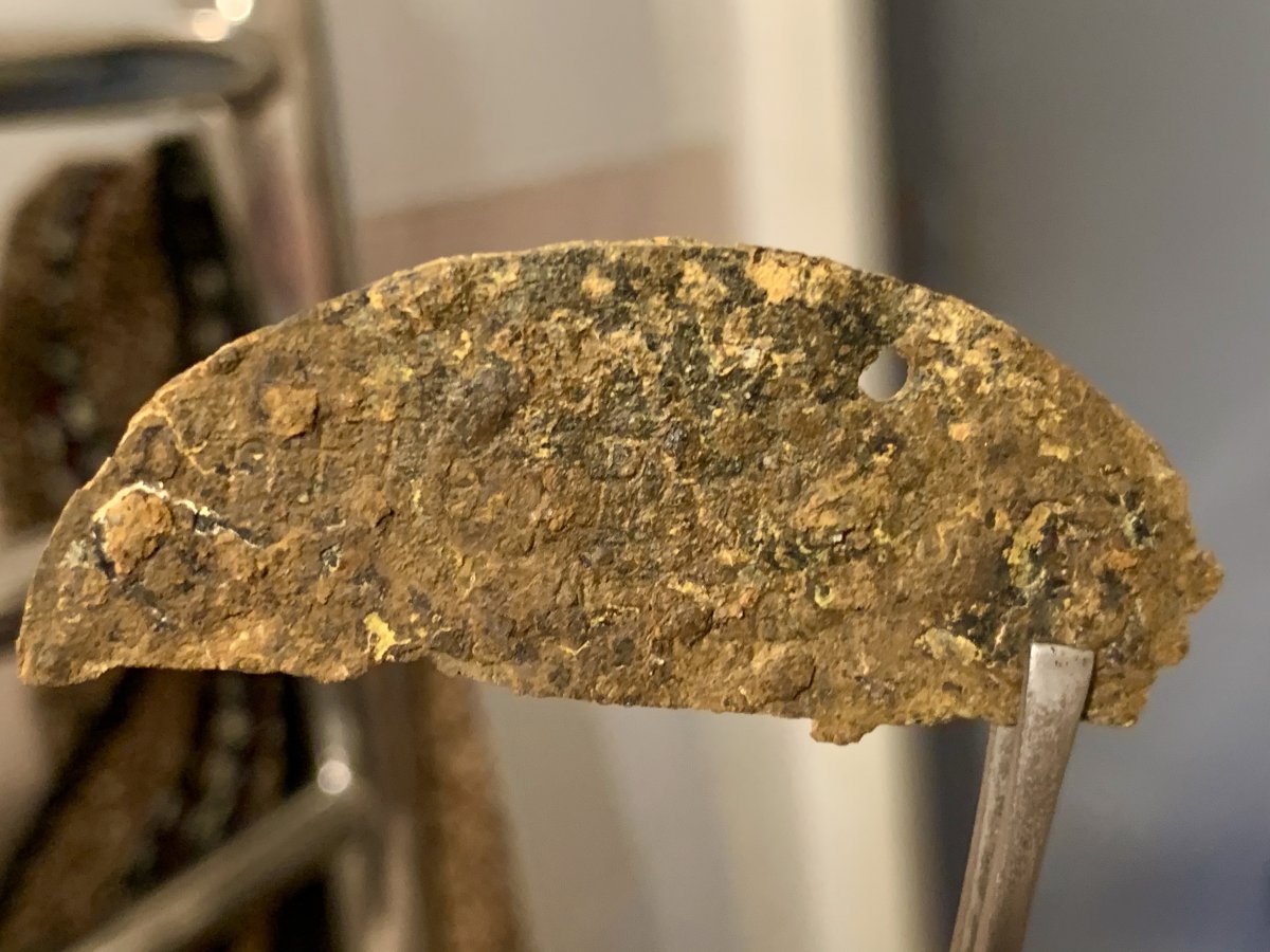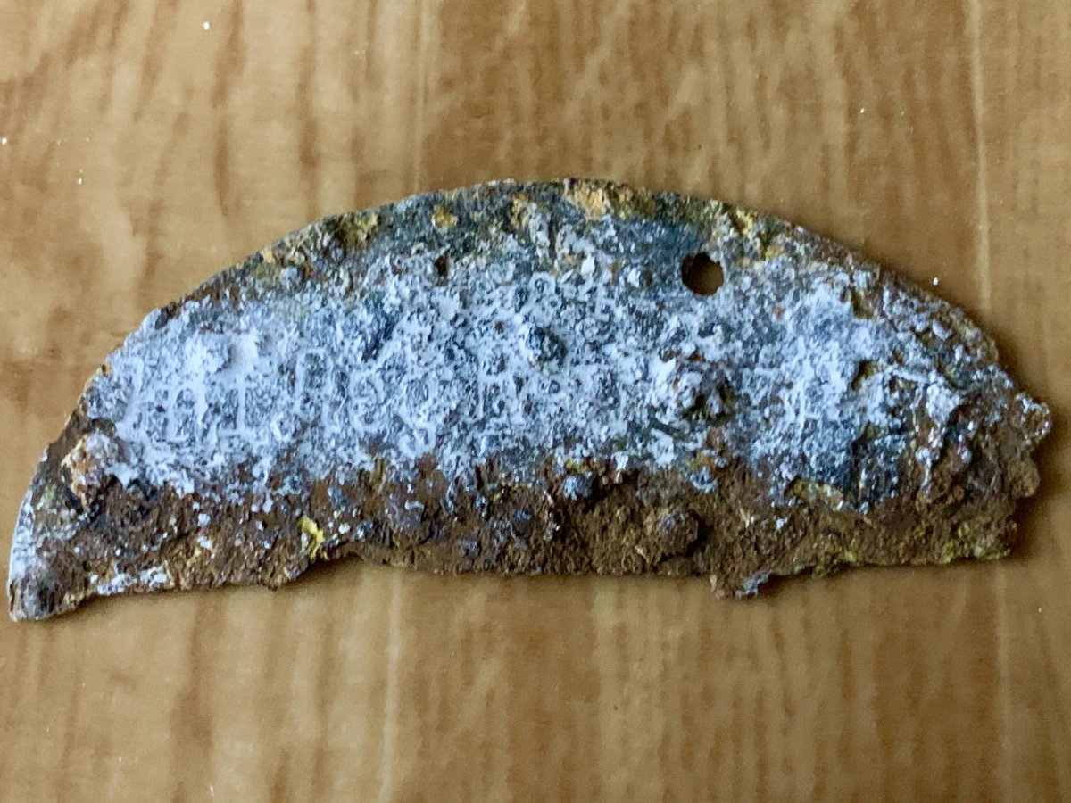 Зрештою, таки вдалося добратись до набивки і методом складання зрозумілих частин набивки на двох половинках, вдалося частково розшифрувати дані з ідентифікатора: Inf. Reg. Retterzug (припускаю, тут банальна помилка, коли замість букв «it” набили «tt”), 216 (питання тільки щодо другої цифри, яка була безнадійно втраченою, але, беручи до уваги схожий жетон цього ж полку по «котлу», який в даний час продається на аукціоні, схиляюсь до такого варіанту), порядковий номер (?)84, група крові А.