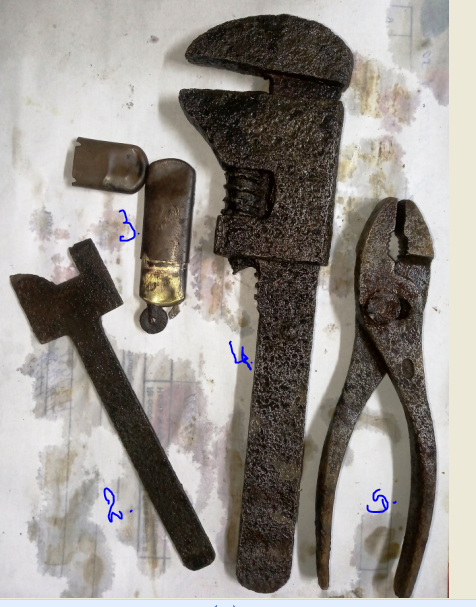 Доброго вечора! Прохання підсказати по знахідкам з хутору біля Дніпра,на 41 рік переправа. 1 Цікавить що то є. 2 Схоже на частину ножиць. 3 запальничка що за надпис не розберу на які роки.4 Що за ключік чій.5 Пасатижі,є два клейма на які роки .Дякую!