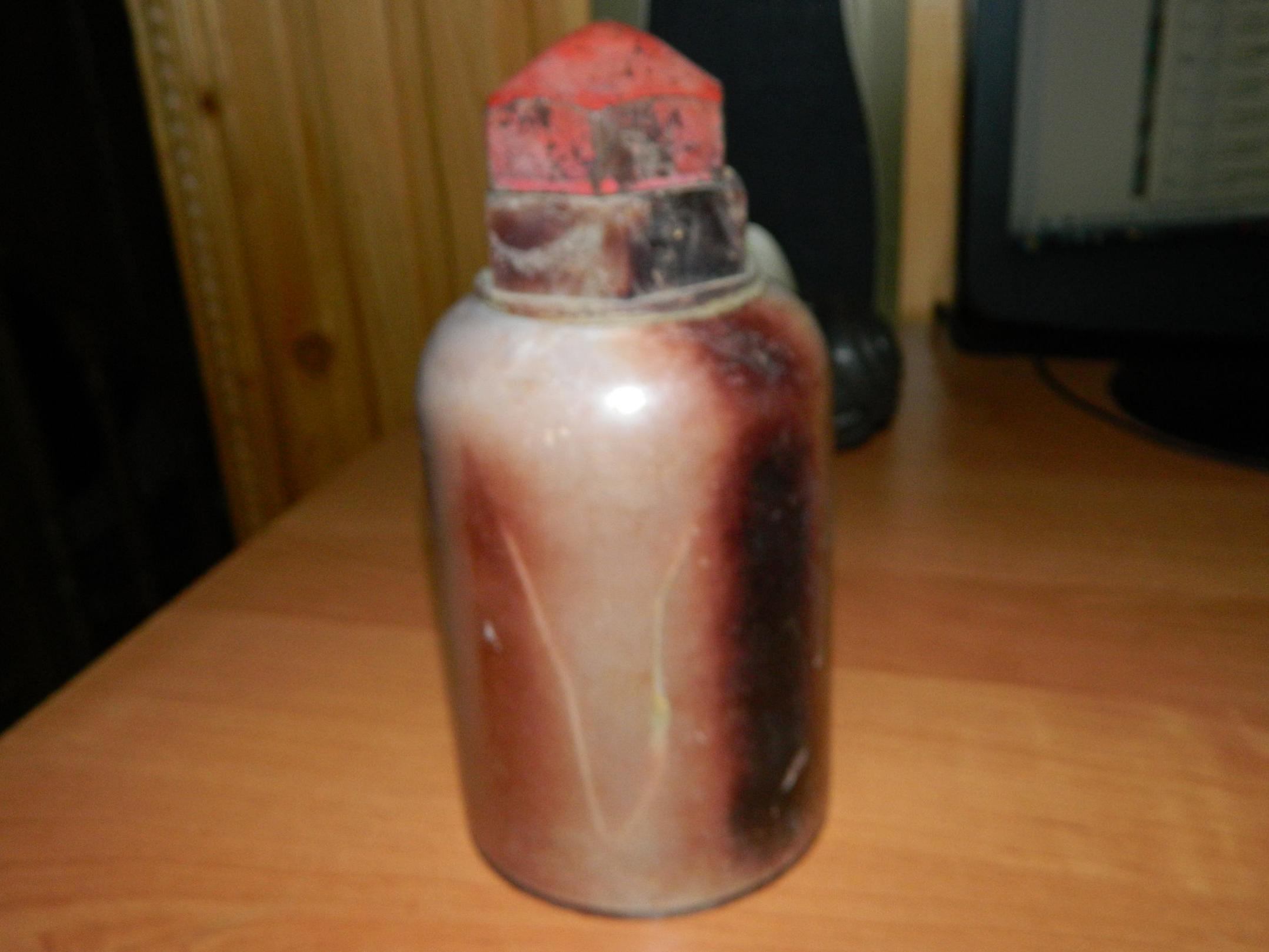 Вот на чердаке нашлась такая банка . от чего она. что то красный цвет крышки меня насторожыл. что ето может быть?