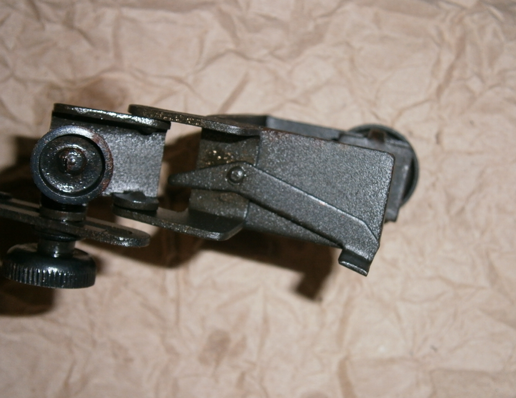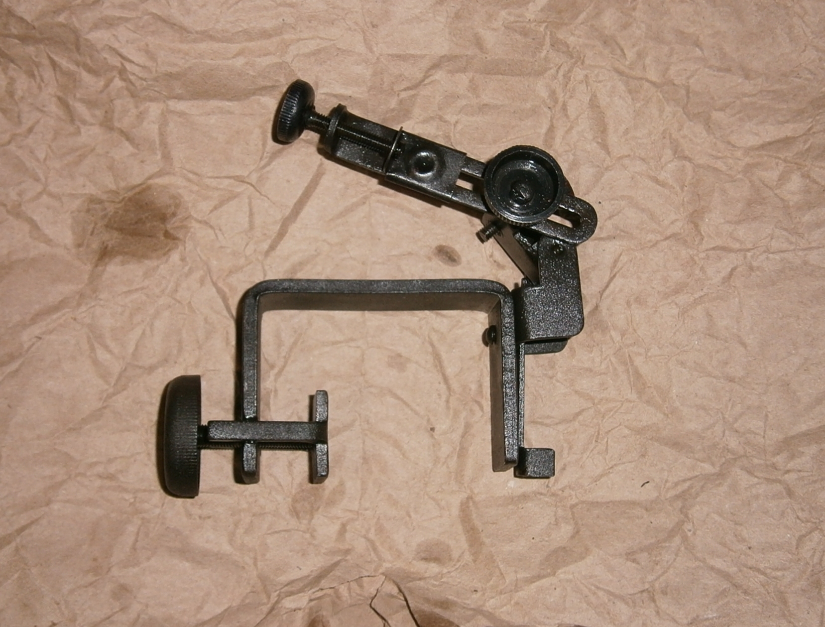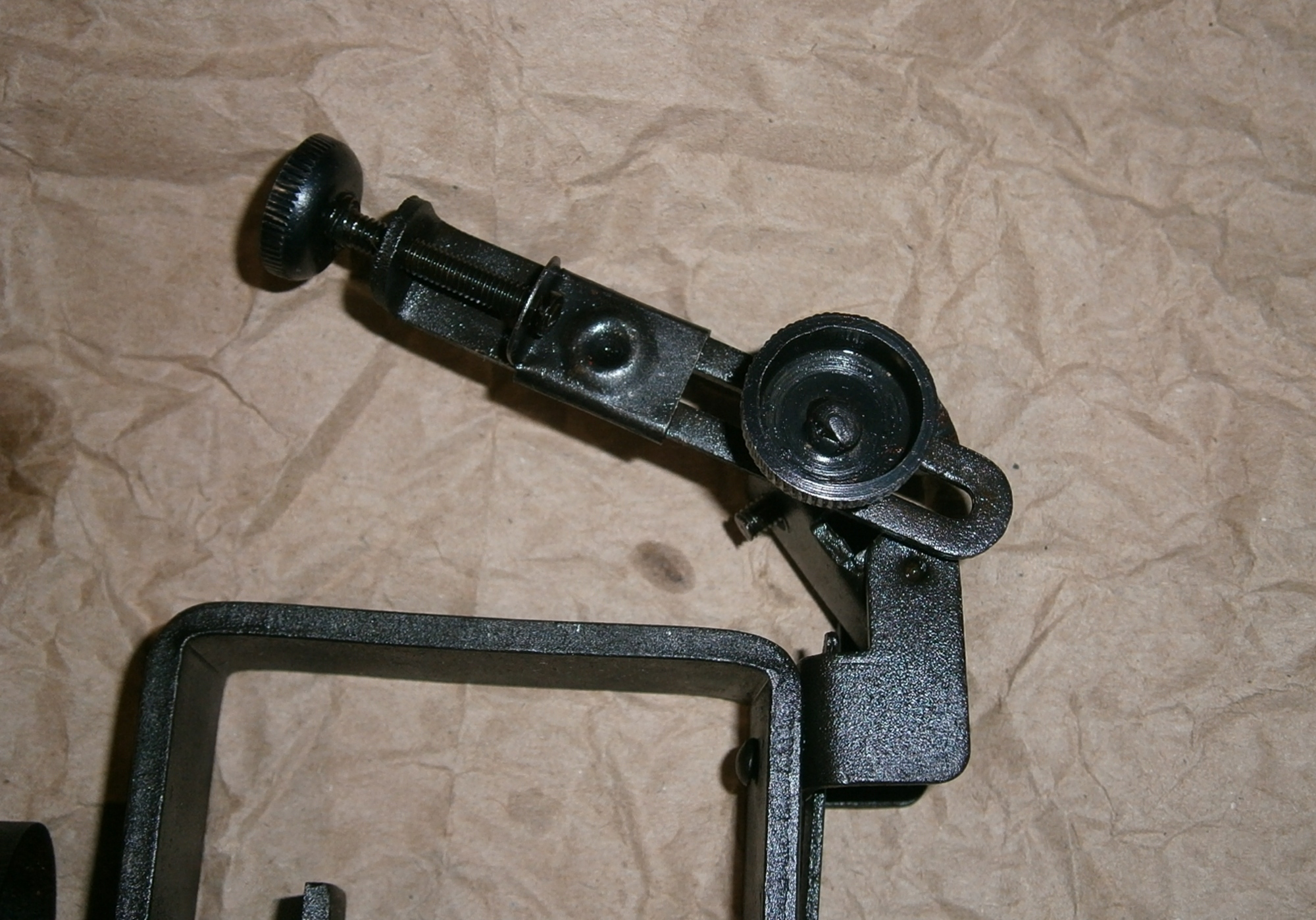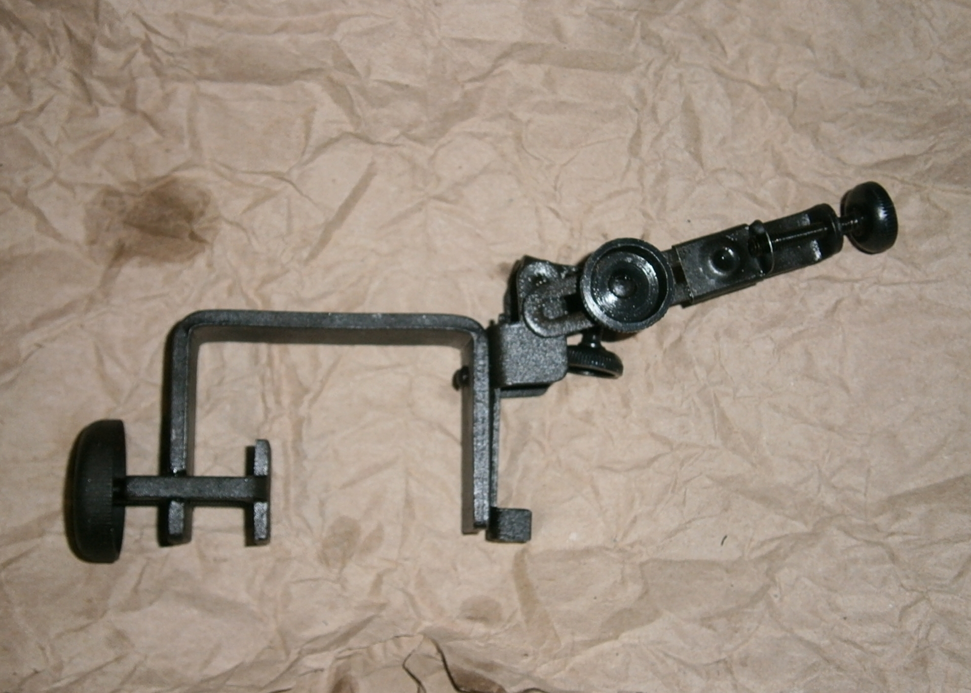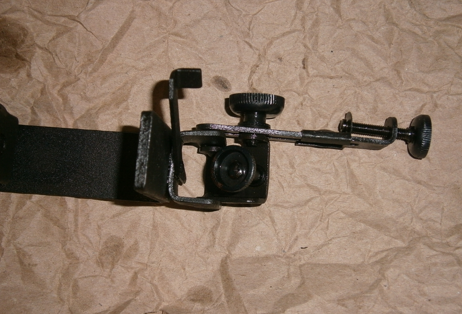 Приветствую! Одно из приспособлений из командирского ящика для обучения правильности прицеливания. Диоптр крепится на оружие при помощи струбцины между глазом и целиком прицела. Сбивается настройка. Обучаемый при помощи винтов наводит диоптр чтобы видеть целик и мушку. Обучающий проверяет.
