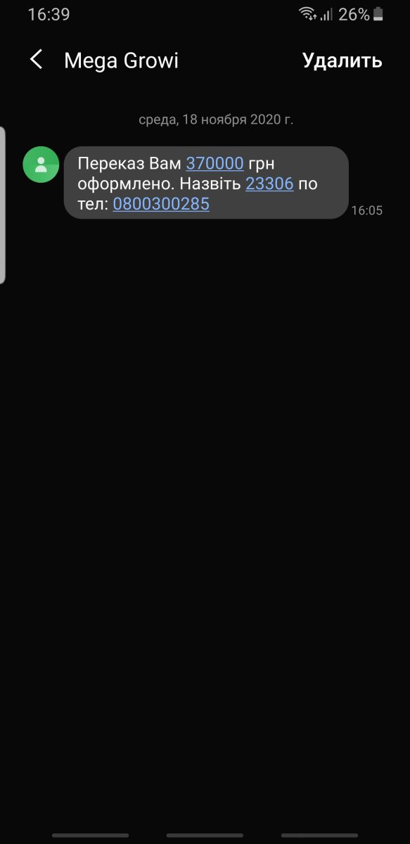 Сьогодні знайомому прийшла подібна смс )))) коли зайшли в магазин де що закупити. Посміялись - але вирішили так не залишати. Звонемо на номер що вказаний на смс. ( тут не той що на скрешоті ). Я. - Ало !? Мені прийшли гроші. Типу банк. - Так назвіть код і т.д.... Я. - Ні. Ви не зрозуміли їх є забагато і Я хочу повернути ... Типу банк. - ? !! не розую вашого питання... Я. - Ну як , дайте рахунок куди Я можу переказати гроші. Типу банк. - Ой. одну хвтлинку , записуйте номер рахунку... Я. - Номеру рахунку замало, мені для підтвердження потрібен 4х значний код та ре....... Типу банк. - ТИ ОХ....В !!!!!! Що за гон !!!!! ІДИ НА Х..... ...... !!!!!!!! гудок.... далі абонемент недосяжний. Ржали хвилин 20 )))))