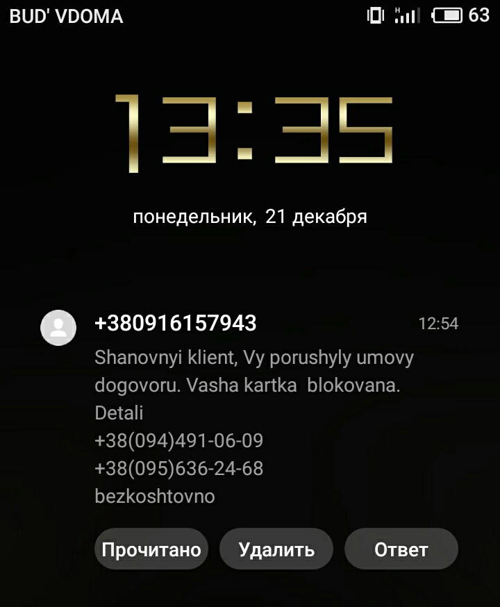 Вот очередной развод На звонки не отвечал, так прислали смс с левого номера, якобы с блокировкой карты кому интересно можете позвонить пообщаться, что там начнут впаривать, главное не попасться на их удочку Мошенники вероятней всего начнут номер карты, дату, последние цифры и паспортные данные узнавать