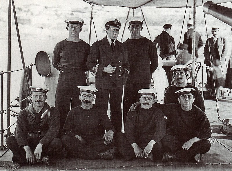 Военная полиция интервентов во Владивостоке, лето 1918 г. В первом ряду — офицер и рядовые Чехословацкого корпуса, во втором — американские морские пехотинцы, выше — японские моряки и несколько британских матросов.
