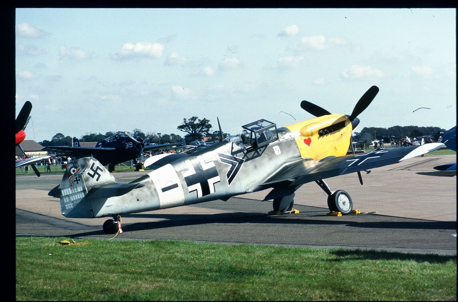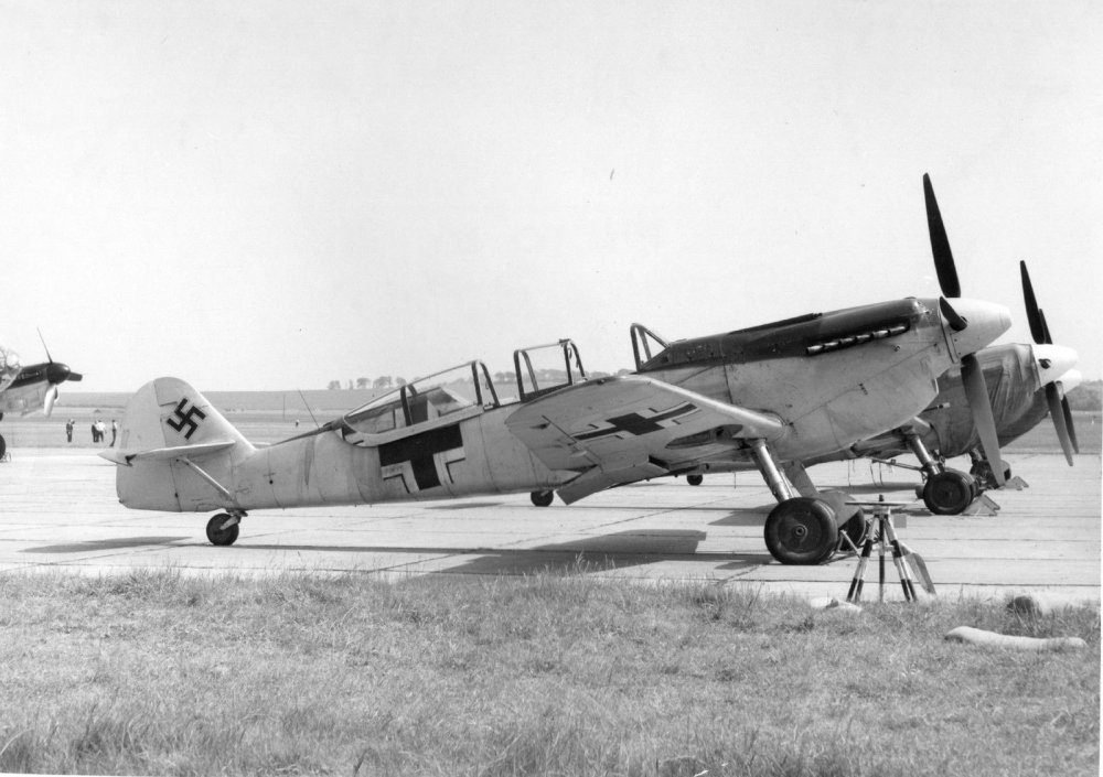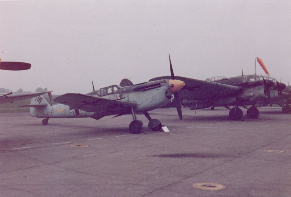 N9939 from 50 years ago. Probably taken at Harlingen, with Spitfire IX MK297 and P38 in the background. HA-1112-M1L WN-234 ex. EdA code C.4K-169 In the BoB film as "Red 5" Today as the Hybrid G-12 Owned by the "Messerschmitt Stiftung"
