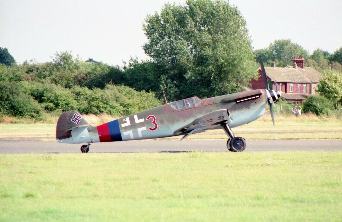 1-2) Battle of Britain is a 1969 British Second World War film directed by Guy Hamilton, and produced by Harry Saltzman and S. Benjamin Fisz. The film broadly relates the events of the Battle of Britain. The script by James Kennaway and Wilfred Greatorex was based on the book The Narrow Margin by Derek Wood and Derek Dempster. 3) Buchon/Messerschmitt 109s can be seen in this shot taken at El Corpero Airfield, Spain, in the spring of 1968. (Photo from the Brian Williams collection, text from Robert J. Rudhall's "Battle of Britain Film - The Photo Album") 4) Hammish Mahaddie, the film's Chief Technical Advisor, stands by one of the "Messerschmitt 109's" while a colleague inspects the cockpit. (Photo from Donald MaCarron, text from Robert J. Rudhall's "Battle of Britain Film - The Photo Album") 5) To get the Rolls-Royce Merlin engine into the Messerschmitt 109 airframe was a real 'shoehorn' job, as can be seen from this uncowled run-up shot. (Photo from Peter Sargent, text from Robert J. Rudhall's book "Battle of Britain Film - The Movie") 6) Two-seater Hispano HA-1112-M4L Buchon ‘Red 11’ (G-AWHC) seen basking in the sun at Sywell Aerodrome this afternoon outside the Air Leasing hangar. Though it is yet to make its first flight, it is hoped that the Buchon will make its debut at IWM Duxford’s Battle of Britain Airshow on 23-24 September.