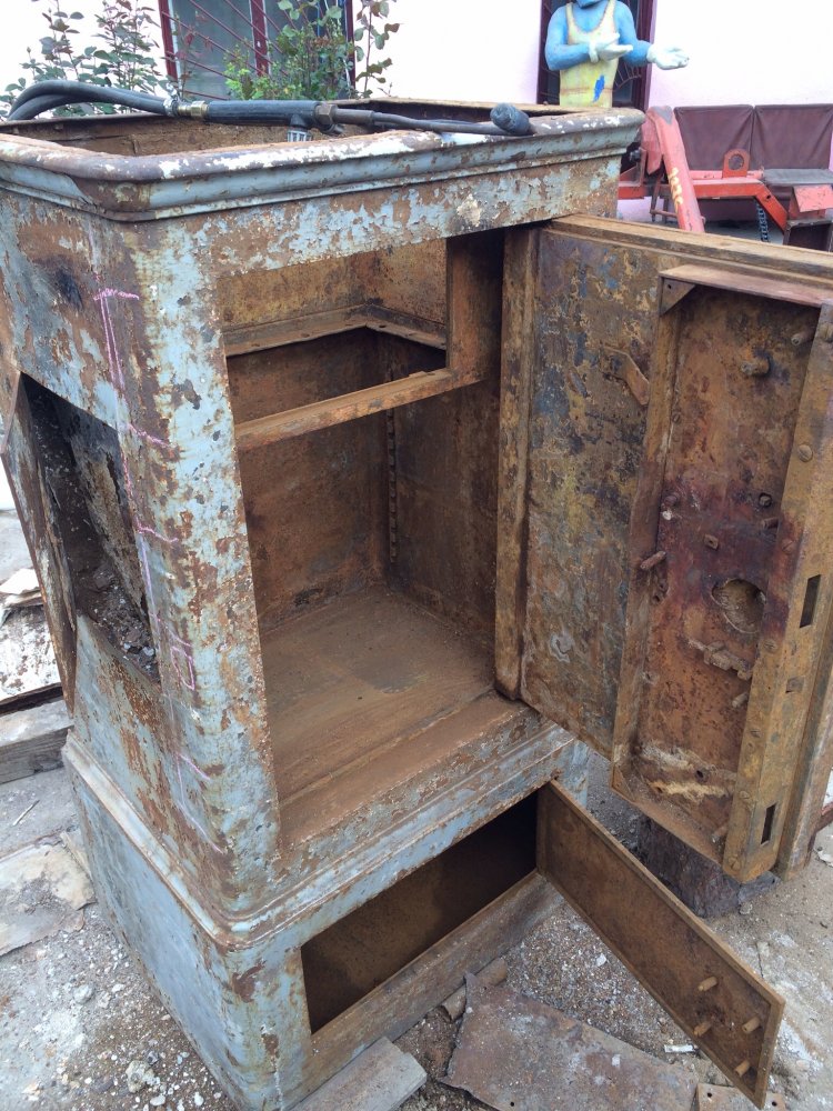 Якщо вірити польським надписам на стінах ( повітре у Львові їх збереглась велика кількість). підвали явно колись використовували під склад крамниці, яка розміщина над ними. Та за совдепії їх провто захлами майже до потолка. Після 5 камазу сміття в кутку надибали ось такий собі панцерник. А , що головне закритий и ключ в замку але обломаний. Ну звісно , вже про себе ділили мерси. Пізно ввечері, ( ключі залишились у нас - бо напліли , що працюем до ночі і т. д.)озроївшись всім інструментом , почали бавитись у ведмежатників. Як на диво WD 40 і пасатіжи створили чудо вже через 5 хвилин. Відкриваєм...