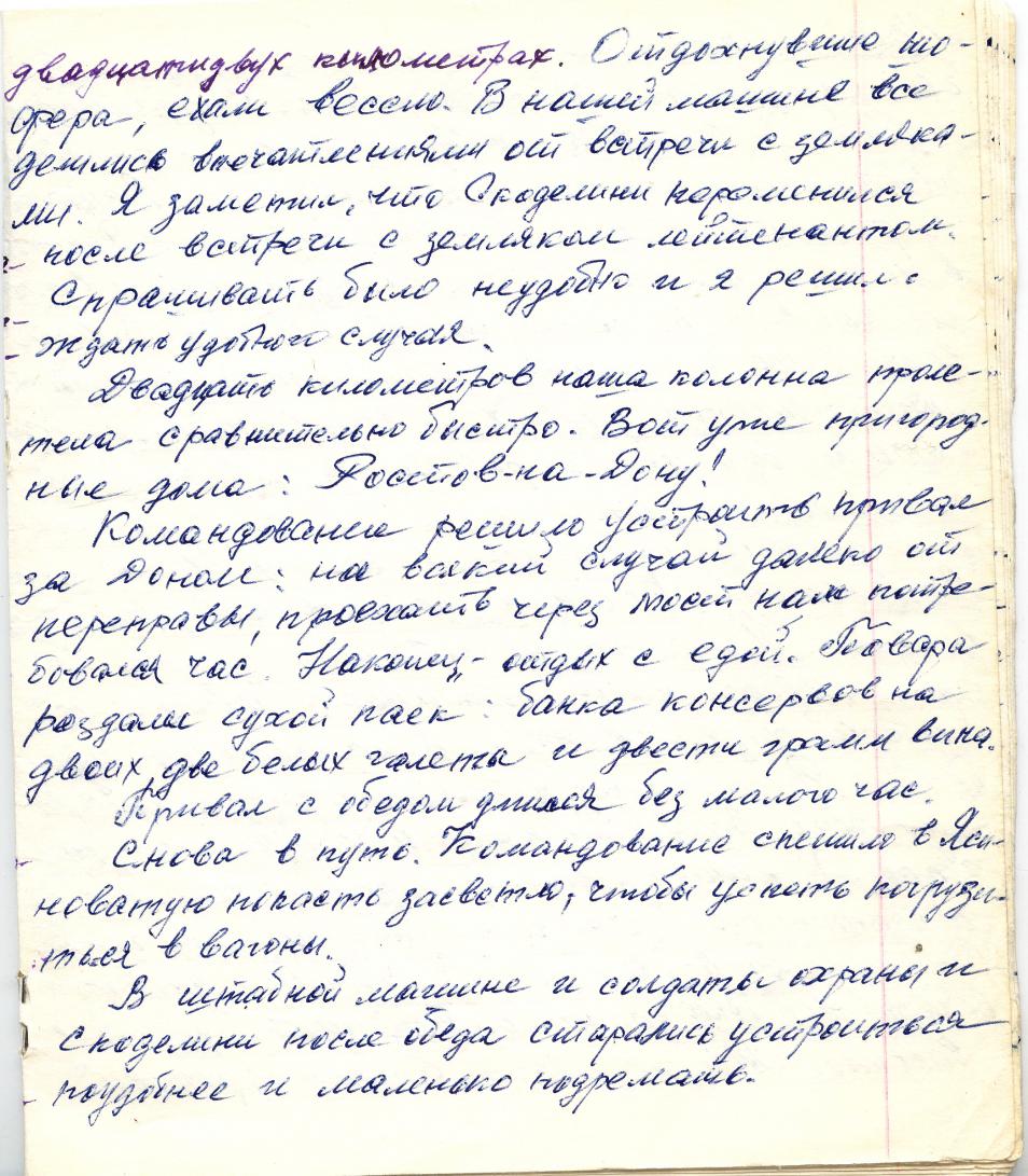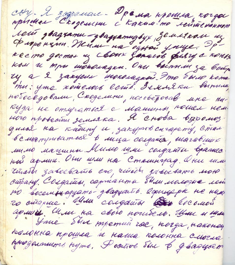 Вот история от Владимира Ивановича (автора рукописных воспоминаний). Летом 1942 года Муссолини распорядился брать в армию галерников (каторжан по нашему) на условиях досрочного освобождения за участие на Восточном фронте. Рассказывает (дело было под Воронежем) - смотрим, движется по дороге дивизия в штатном составе, в зимнем обмундировании, с техникой и орудиями... Пришли, пообщались с ветеранами, после чего развернулись и двинули назад. Вроде бы под Днепропетровском немцы попытались остановить их перед мостом через Днепр, но итальянцы выкатили орудия на прямую наводку и под таким прикрытием беспрепятственно пересекли реку. Да и что могли сделать немецкие тыловики? Дело было в конце октября - начале ноября. Я понимаю, что в те времена это было закрытой информацией, да и очень скоро стало вообще не до этого, но меня интересует достоверность данного события.