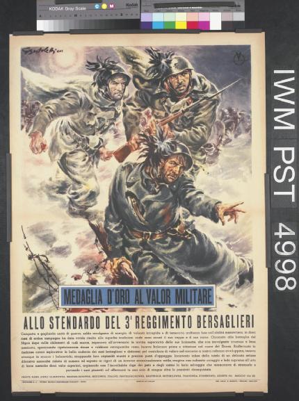 Medaglia d'Oro Valor Militare Decreto 30 gennaio 1948 "Compatta e gagliarda unità di guerra, salda amalgama di energie, di volontà intrepida e dì temeraria arditezza fusa nell'abilità manovriera, in dieci mesi ardua campagna ha dato vivido risalto alle superbe tradizioni, onde sono onusti il suo ceppo ed il suo nome chiamato alla battaglia del Nipro d opo mille chilometri di rudí marce, imponeva all'avversario la invitta superiorità delle sue baionette, che con travolgente irruenze e lena inesausta, sgominando ripetutamente dense e rabbiose retroguardie nemiche, faceva balenare prime e vittoriose nel cuore del Donez. Riaffermata in rischiose azioni esplorative la bella audacia dei suoi battaglioni e distintosi pel contributo di valore nel soccorso a nostra colonna avviluppata, teneva ovunque in scacco l'avversario, strappandogli capisaldi muniti e preziosi punti di appoggio. Incaricato infine della tutela di un delicato settore difensivo, ancorché ridotto di numero ed esposto ai rigori di un inverno eccezionalmente ostile, reagiva con indomito coraggio e fede suprema all'urto di forze nemiche dieci volte superiori, arginando, con l'incontrollabile diga dei petti e degli animi, la furia che minacciava di stremarlo e portando i suoi piumetti ad affermarsi in una scia di sangue oltre le posizioni riconquistate. Fronte Russo. Nipro, Uljanowka, Maximaljanowka, Sofjewka, Stalino, Panteleimonowka, Rassipnaja, Michailowka, Stoshkowo agosto 1941 - maggio 1942. (см. фото) Medaglia d'Oro Valor Militare Decreto 31dicembre 1947 "Superba unità di guerra, non paga del grande sangue versato e delle eroiche imprese compiute nel precedente cielo operativo, si prodigava ancora con suprema dedizione per il buon esito in numerosi combattimenti. Balzato per primo dalle posizioni tenacemente difese durante tutto l'inverno, prendeva d'assalto un importante centro ferroviario e creava la premessa per afferrare alla gola il nemico ripiegante, distruggerlo e conquistare una ricca zona mineraria. Lontana avanguardia delle truppe italiane in Russia con la 3^ Divisione Celere, slanciatosi con fulminea marcia dal Donez al Don, attaccava e conquistava con dura e sanguinosa lotta una munitissima testa di ponte, sconvolgendo il piano offensivo nemico. Travolto l'avversario in rovinosa fuga, ne frustrava i successivi suoi ritorni offensivi compiuti con forze sempre rinnovantisi. Chiamato all'arresto di masse nemiche transitate sulla destra del Don, le ricacciava con impetuoso attacco; quindi, inchiodato al terreno, costituiva insormontabile barriera ai reiterati, sanguinosi, ma vani assalti nemici, spezzandone l'impeto e facendo brillare di piena, fulgida luce, di fronte agli alleati ed allo stesso nemico, le virtù guerriere delle stirpe italica. Fronte Russo. Rassipnaja, Staz, Fatschewka, Iwanowka, Serafimowitsch, Broboski, q. 244,4 Jagodnyi 11 luglio - 1 settembre 1942. К сожалению, нигде не могу найти "удостоверения" о награждении полка второй золотой медалью за русскую кампанию. Дважды был награжден и 6-й полк берсальеров, но об этом только скупые тексты в разных источниках. А ведь тут интересно. По первой медали - Orlowo, Iwanowka, Bokowo, Antrazit, Bobrowski, q. 224 Jagodnyj q. 208 febbraio-settembre 1942 и вдруг, по второй медали - Fiume Don, fiume Dniepr, 17-31 dicembre 1942 - 20 febbraio 1943 (???). Как появился Днепр 1943г. в достаточно достоверном источнике?