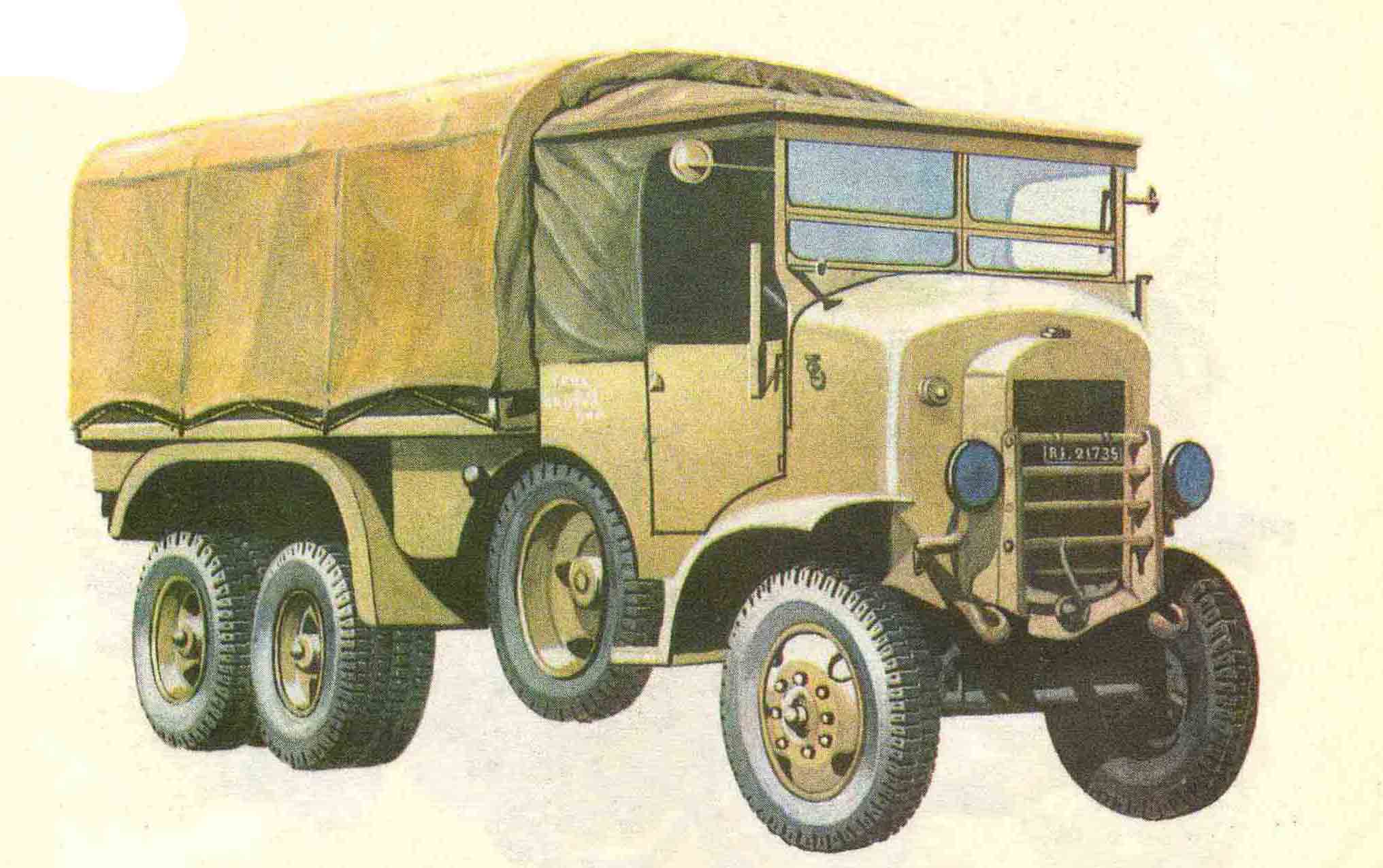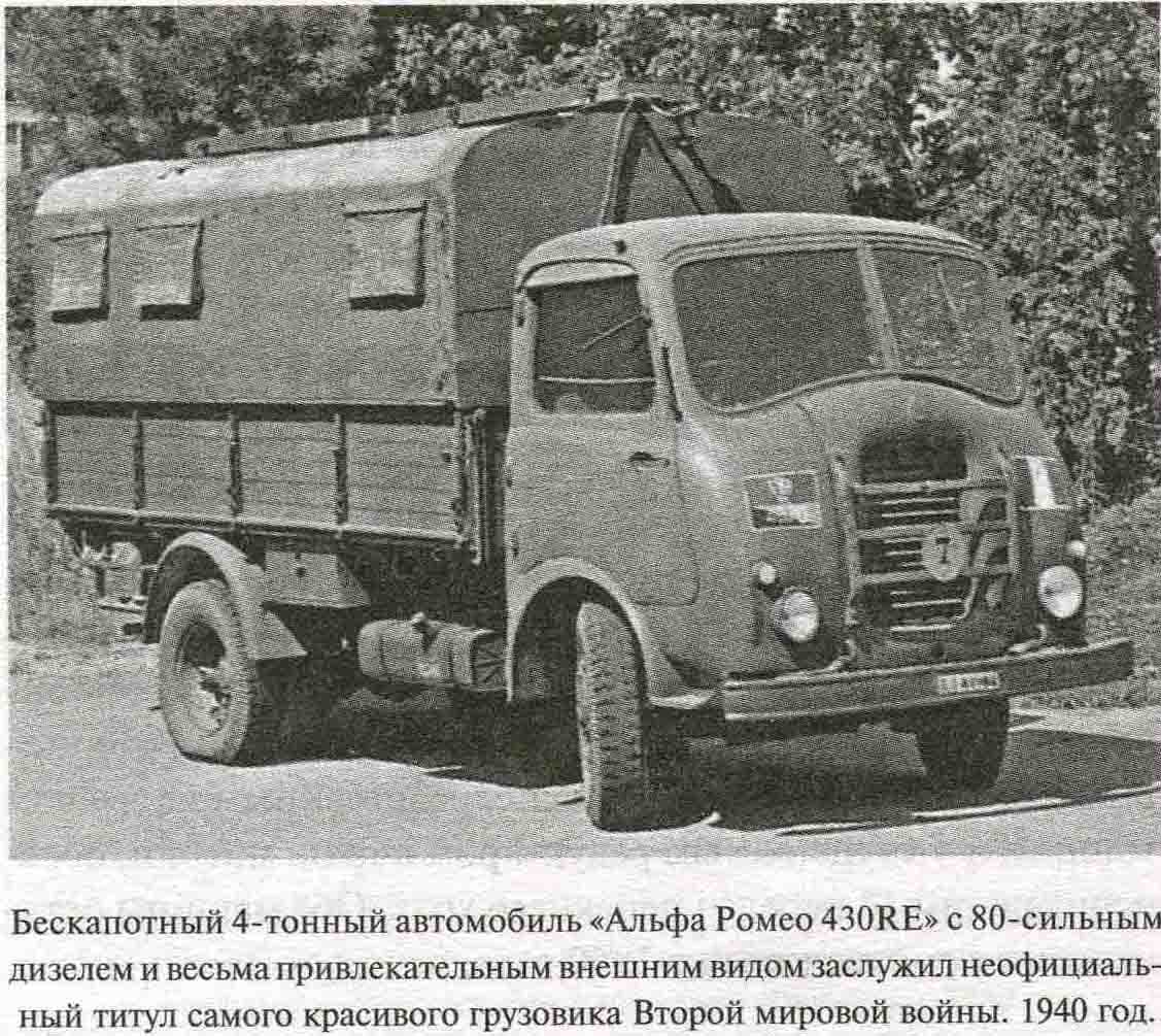 На фото слева просматривается самый красивый армейский грузовой автомобиль Второй мировой войны Альфа Ромео 430RE. Отличался привлекательным дизайном с характерными выпуклыми очертаниями обтекаемой цельнометаллической кабины над двигателем и утопленным в ее переднюю панель радиатором. Несмотря на свою легкомысленную невоенную внешность, он одним из первых получил статус стандартизированного грузового автомобиля армии Италии. Оставался в производстве с 1939г. по 1950г.