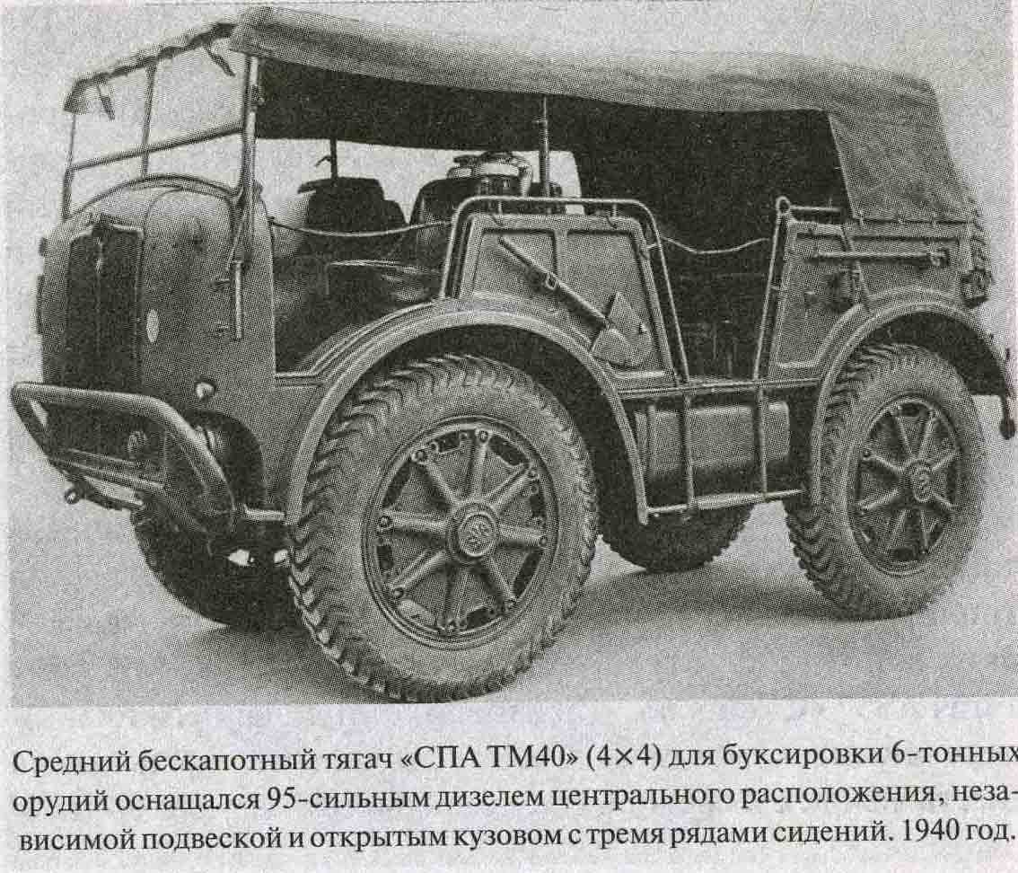 Об этом зверь-аппарате из книги Евгений Кочнев. Военные автомобили Вермахта и его союзников. М. ЭКСМО. 2009. : ...средний бескапотный тягач SPA TM40 с увеличенной до 2600 мм. колесной базой и независимой подвеской всех колес на поперечных рессорах с гидроамортизаторами двухстороннего действия. Он был разработан фирмой Павези в 1938г. и рассчитан на буксировку орудий массой до 6 т. На этой машине 6-цилиндровый дизельный двигатель ФИАТ - 366 (9,4 л, 95 л.с.) размещался между передними сиденьями, за которыми находился открытый отсек для шести членов расчета буксируемого орудия, располагавшихся на одном заднем и двух индивидуальных сиденьях, обращенных спинками против движения. Тягач был оборудован 24-вольтовым электрооборудованием, тормозным гидроприводом с вакуумным усилителем и шинами размером 11,25 - 24 или 12,75 - 32. Он весил 6600 кг и на ровной местности развивал скорость 44 км/ч. С 1941 г. на его базе выпускался короткобазный 2,5-тонный бортовой грузовик-тягач Т40, моцность двигателя которого повысили до 108 л.с. Несмотря на сильные бомбардировки союзнической авиации в ноябре 1942г. и в 1943 - 1944 годах, завод SPA продолжал работать, и большинство таких машин оставалось в производстве до 1948 года, после чего тягач "СПА ТМ40" выпускался как "ФИАТ ТМ48".
