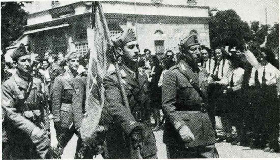 Раз уж зацепились за знамена... 1. Знамена 38-го и 37 - го полков Ravenna 3-ей пехотной дивизии Ravenna вышедших из России на параде по случаю прибытия в место расквартирования г. Тортона провинция Алессандрия область Пьемонт. Май 1943г. Между знаменами начальник штаба дивизии Ravenna полковник Paolo Ducros (Паоло Дюкрос). 2. Во время парада. Рядом со знаменем нач. штаба дивизии полковник Paolo Ducros (Паоло Дюкрос). 3. Знамя кавалерийского полка Savoia Cavaleria. Слева командир полка полковник Bettoni (Беттони). 4. Кавалеристы Savoia Cavaleria со знаменем. 5. Знамя (похоже, в чехле) 3-го артиллерийского полка кавалерии в Ворошиловграде.