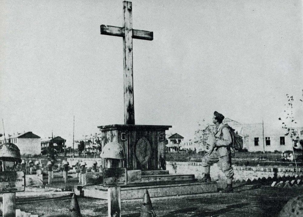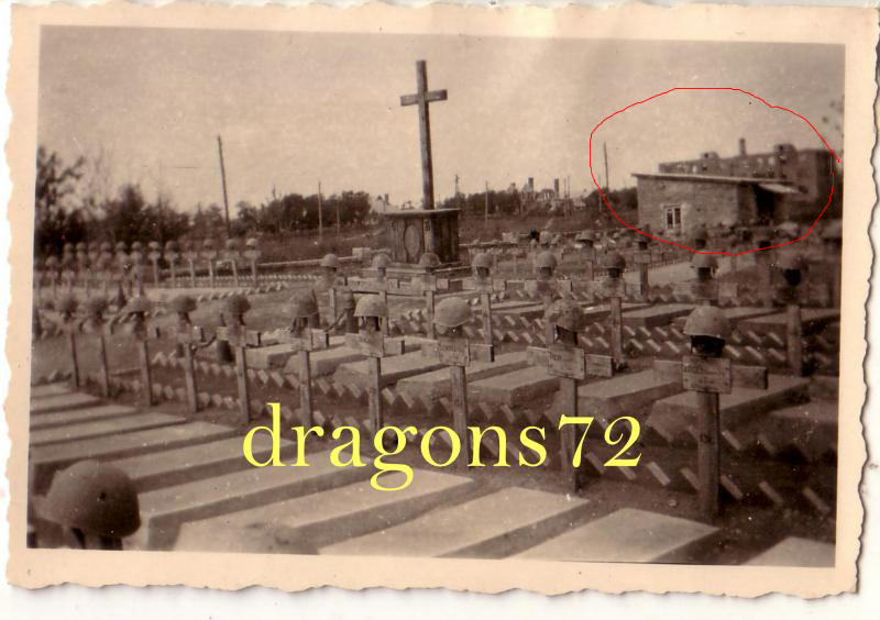 Может, кто опознает этот цвинтар?[/quote] Охотно,камерад Aryason! Первое фото. Подписано так: Наш военный журналист во время визита на военное кладбище в Рыково. Возле могилы генерала De Carolisa старший сержант Matteo Ronca. (Могила генерала на первом плане фото, ограждена вертикально стоящими снарядами) Второе фото. Обратите внимание на монумент с крестом в центре - он тот же, что и на первом фото. Но, возможно эти монументы изготавливались типово и ставились по итальянским воинским мемориалам в России? Но, нет же, видите по средине одна из могил ограждена вертикально стоящими снарядами? Это могила Ugo De Carolis'a. Дальше... Я обвёл красной линией сарайчик на первом плане, с косой крышей и одним окном посредине, я за ним трёхэтажный дом, вроде разрушенный или не достроенный? Эти объекты фигурируют и на двух последующих фото. Одна из них ваша и одну привожу я. Третье фото. Фото приводимое вами, камерад Aryason. Опять же, те же объекты я выделил. И ещё, на этом фото хорошо видно, обратите внимание на красивый металлический заборчик. Четвёртое фото Фото из моего архива. Вот вам сарайчик с косой крышей и одним окном по средине, за сарайчиком видим трехэтажный дом без окон и без крыши (недостроенный, или, может, сожгли?) Обратите внимание на металлический красивый заборчик, он совпадает по виду с заборчиком на предыдущей фотографии. Вывод. Опираясь на тот факт, что бригадный генерал Ugo De Carols был похоронен на военном кладбище в Рыково могила №170, а на всех четырёх фотографиях запечатлено одно и то же место с разных ракурсов, возможно, в разное время года, утверждаем на 100% что это Рыково или по совремённому Енакиево.