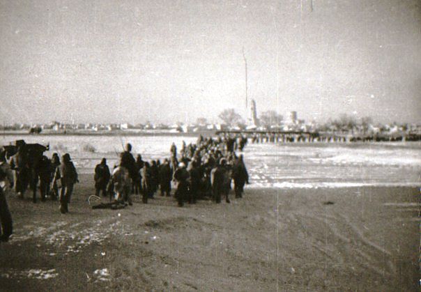 Понтонный мост через Днепр. Два фото, сделанных в разное время. 1. Итальянцы и немцы совместно охраняют переправу. 2. Август 1941г. Здесь не могу разобрать, что за двое стоят у берега. Итальянцы, немцы?