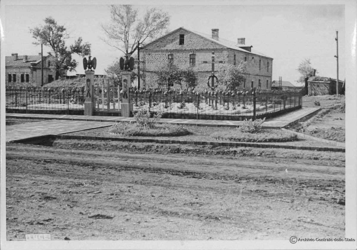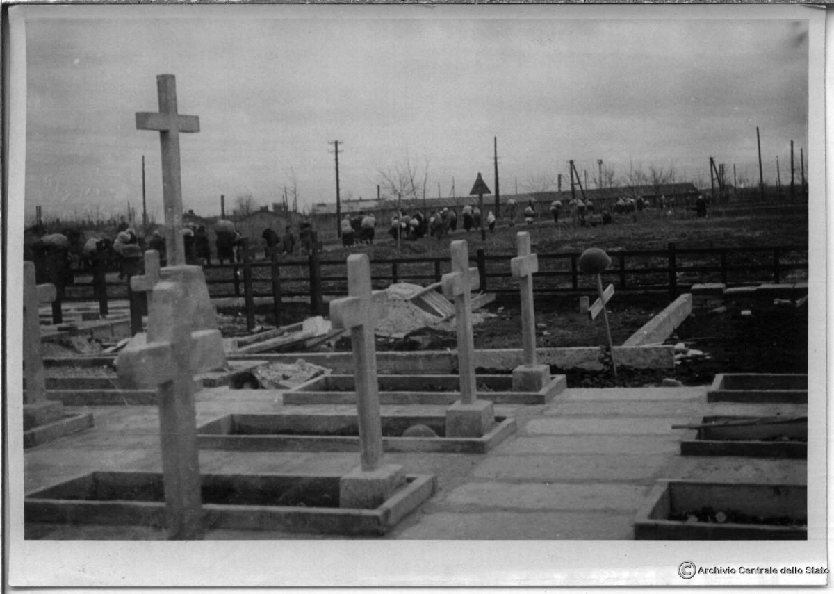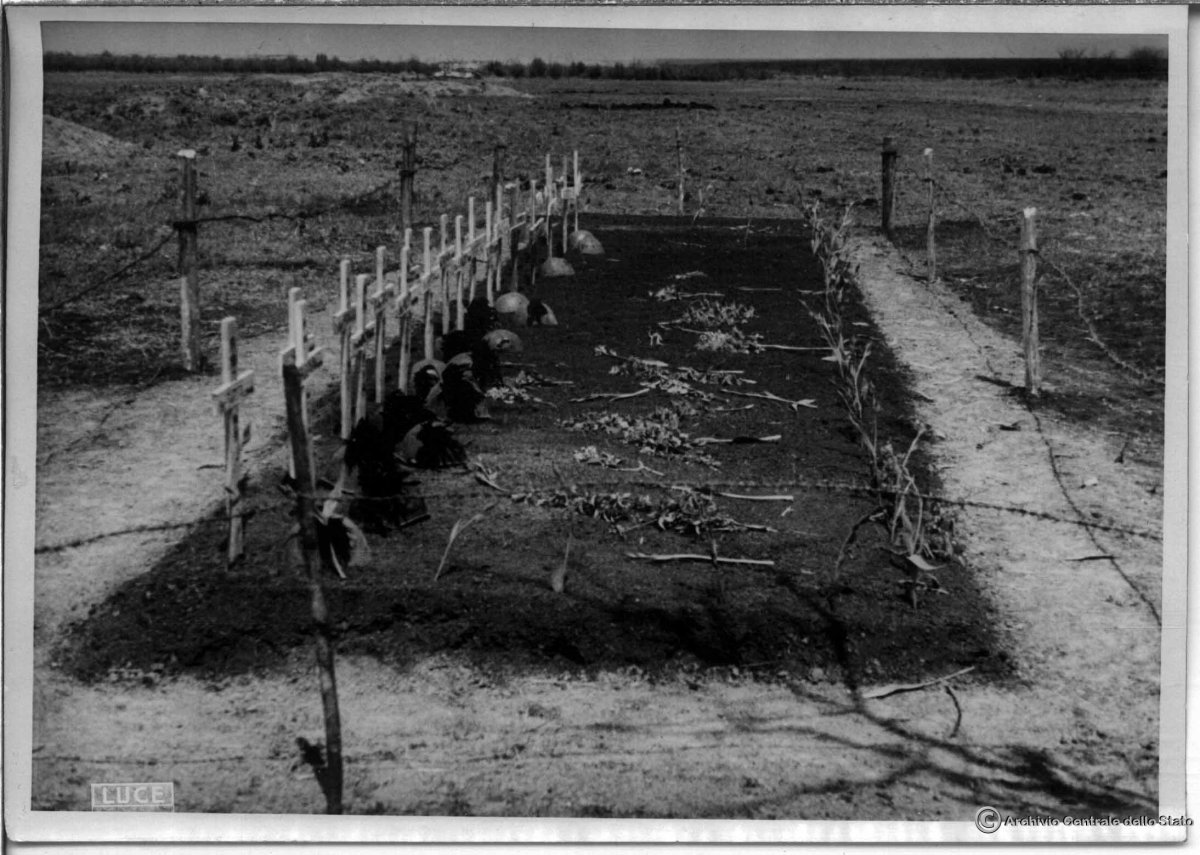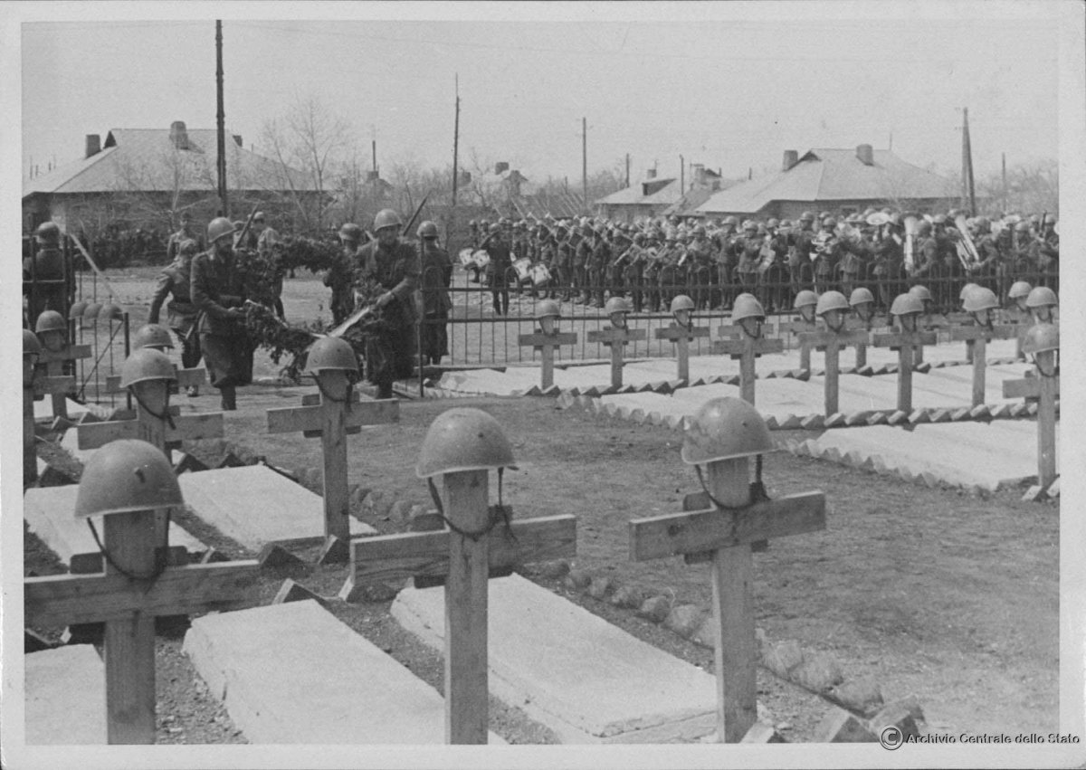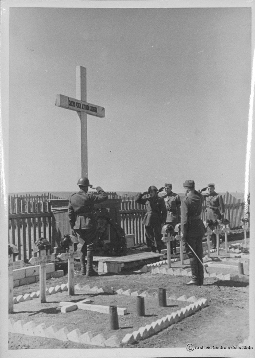 1, 2 - Cerimonia presso un cimitero di guerra italo tedesco in Russia nella primavera 1942 3 - Veduta di un cimitero di guerra in Russia nella primavera 1942 4 - Il generale Guglielmo Barbò di Caselmorano nella primavera 1942 dirige i lavori per la riattivazione della strada interrotta dai russi in fuga dopo la battaglia di Charkov 5 - Tombe di italiani in un cimitero di guerra in Russia nella primavera 1942 6 - Soldati schierati in un cimitero di guerra in Russia nella primavera 1942 Отсюда:http://www.televignole.it/foto-storie-guerra-89/ http://www.televignole.it/foto-storie-guerra-91/ http://www.televignole.it/foto-storie-guerra-92/