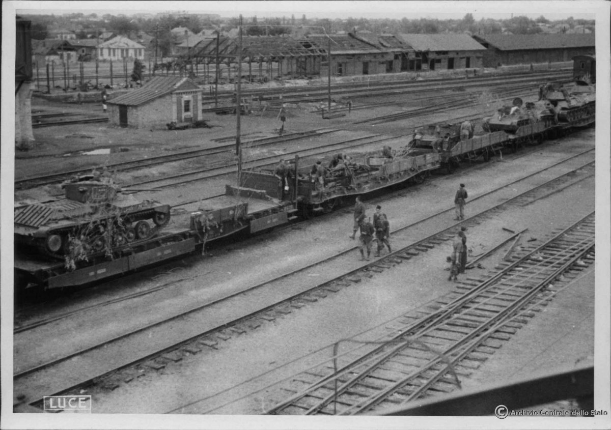 Показывали здесь в теме фотографии выполненные на станции Миллерово 3 августа 1942 года сержантом-любителем Andrea Carraglia, посты #2026 и #2028. https://reibert.info/threads/italjancy-v-rossii.12526/page-82 Есть более полная серия снимков станции Миллерово выполненных профессионалом из L.U.C.E. Здесь зафиксирован состав с битой советской техникой. Мы видим и этот же Бостон, и Т-60, и Т-34-76 производства Сталинградского завода с характерной дульной маской и прямоугольной нашлёпкой внизу башни, и английский Валентайн. От Валентайн стоит на платформе, на которой ясно видно знак советских железных дорог. Думается, что это не немцы перевозили битую технику, как я предполагал в предыдущем посте. Скорее всего это перевозили наши для ремонта или как для поставки запчастей. А Миллерово было сдано вместе со всем этим добром. Дата сдачи 15 июля 1942 года, как раз за две недели до съемки итальянцами.