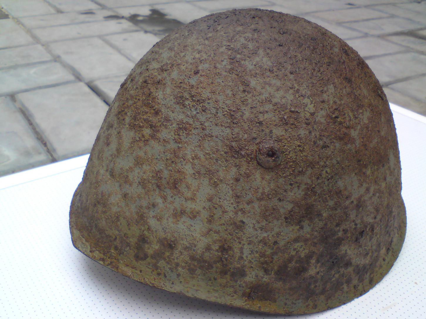 Откапалась вот такая каска,крепкая,остатки краски,подшлема.Небольшая трещина спереди.Подбородочник мягкий рабочий.Интересны заклепки крепления подшлема и сам подшлем.Может из ранних?