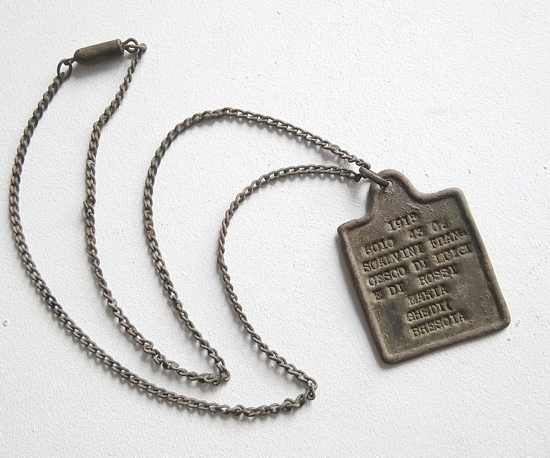 Нашёл на одном из сайтов : Возможно это более ранний образец итальянского ЛОЗ. По второй мировой встречался и даже часто присутствовал у владельца вместе с более поздним латунным. Представляет цинковую табличку с 4-я отверстиями и скругленным углам, заполнялся от руки с помощью ручки с пером, которую обмакивали в химический раствор для цинкографии. Получались не стираемые надписи черного цвета. Итальянцы так и называют их: piastrino - "табличка". Пришивались за углы обычно под воротник кителя или шинели.