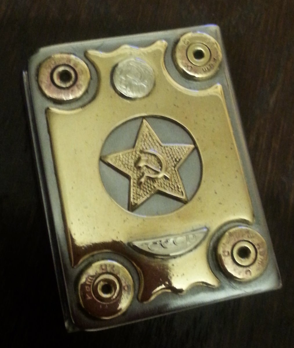 Увидел на просторах инета спичечницу фрицевскую решил замутить свое.Танк с петлицы 50 х годов.34 ка.Звезда с латунной пуговицы той же шинели.Донца гильз от люгера.