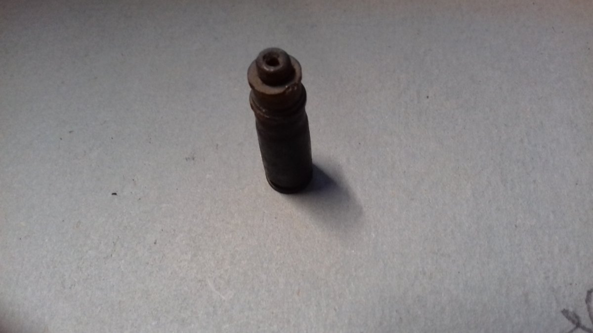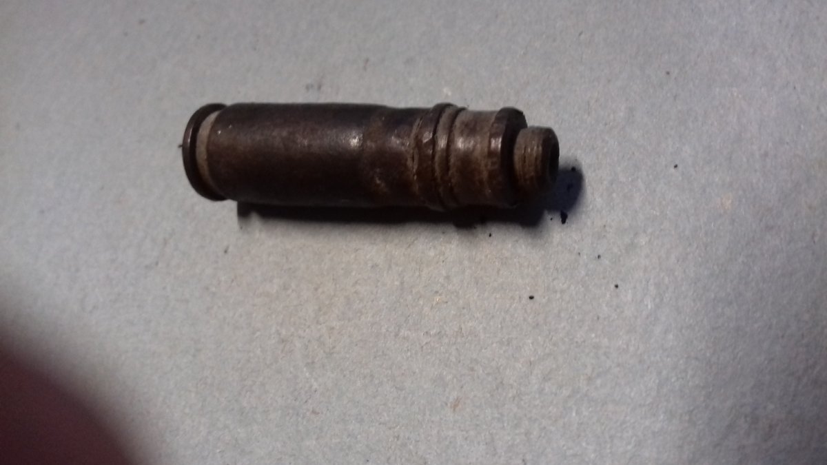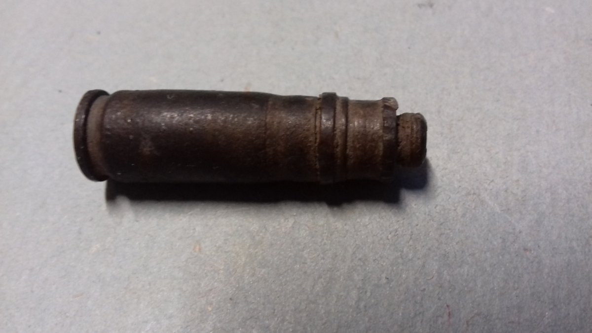 вот попалась такая штука из гильзы с какой то вставкой. что бы это могло быть? маленькое отверстие с торца было забито землей. иголкой земля пробилась. внутри на половину вроде пусто, так как иголка входит до половины гильзы. вставка тоже из цветного метала. пытался вытащить плоскогубцами, но не поддается, видимо зажата хорошо. Маркировка на гильзе не читается.