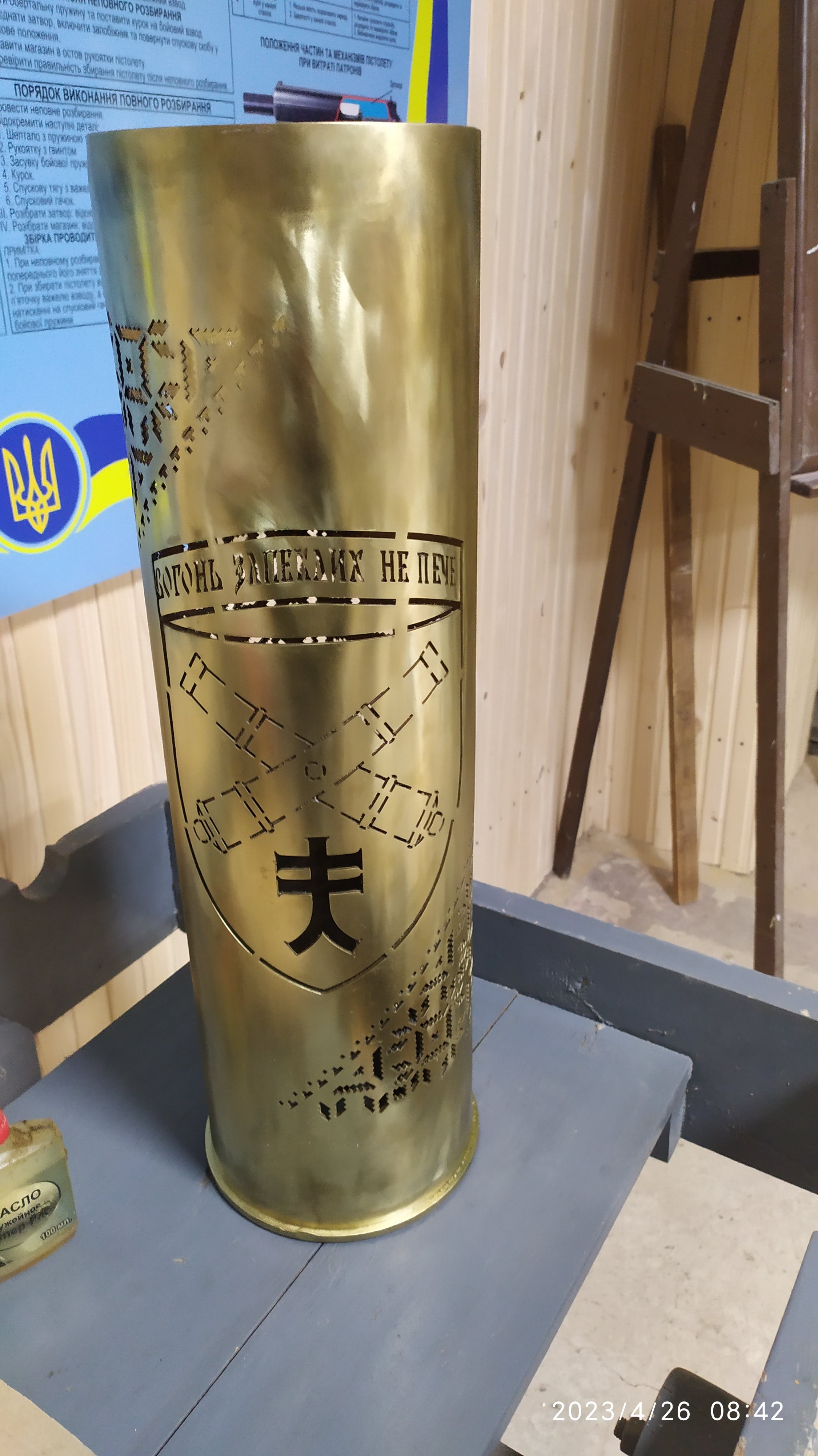 Привіт, зробив лампу-міну-світильник. Давно виношував ідею, шукав підходящу для задумки розірвану мінку. Знайшов. Платформа - приварене до хвостовика міни донце гансючої арт гільзи 105 мм. Міна - совітська 80 мм. Малий цоколь лампочки. Між перами стабілізатора приклеїв макети патрів мосінок. Не фарбував і не буду, так має красивий антуражний вигляд. :beer: