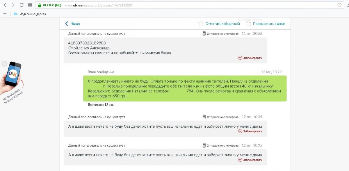 Я также в ярости от этих гомодрилов кидающеобразных с ОЛХ! Один раз мотоцикл-иномарку в Житомыре покупал - выставлен был за 14500 гривен (при рыночной стоимости 40-50 тыс гривен.), но продавец просил половину пересыла Новой почтой ему скинуть, как страховку, что я мот заберу (а это примерно 1000 грн). И понимаю, что лохотрон, но всё же доиграл пьесу до конца - благодаря своей службе у меня есть колеги в каждом городе Украины, связался с коллегами, поросил подьехать посмотреть байк, если всё ок - оплатить и выслать мне, коллеги согласились помочь,в течении 2 часов собирались подъехать, о чём сообщили продавале-кидале, закончилось тем, что кидала начал юлить, и по концовке убила фраза "ну хоть 200 грн. перешли, что б я его для тебя держал, а всем остальным отказывал". Я ответил отказом. А он: "А, нет, тогда я продаю другим". Почти также "покупал" гантели+штанга всего за 600 грн. Слава богу, благодаря коллегам в других городах ещё ни разу "не встрял". Сейчас кстати закончились затяжные переговоры по разборным гантелям Barbel по той же схеме - уточняю, мол отправишь? Говорит - отправлю и скидывает номер карты, мол жду денег. Пишу денег не будет, пока мой человек не осмотрит гантели. А когда осмотрит и всё ок - сразу расчитается. (По такой схеме в Одессе уже приобрёл пару разборных гантелей). Так этот скот с г. Ковель пишет, что без денег никуда и везти их не будет. Как видим, кидок верняковый опять какое-то чмо хотело исполнить классику ОЛХ. Забегу наперёд - попросил коллегу организовать забор с адреса и если всё ок, расчитаться. Я запросил у продавца адрес - и кидала поспешил самоудалится. Как видим - неудавшаяся попытка финансового броска через буй не удалась, продавала самоудалился с ОЛХ. Ведь будь я продавцом, который хотел бы продать товар - мне бы не в падло было в пределах города отвезти не габаритный товар, и получить сразу за него деньги. Классика. Заодно страна должна знать своих Хероев: 4188373028189808 Смойленко Александр. Хотя не факт, что карта его, и ещё больший не факт, что он вообще с Ковеля.