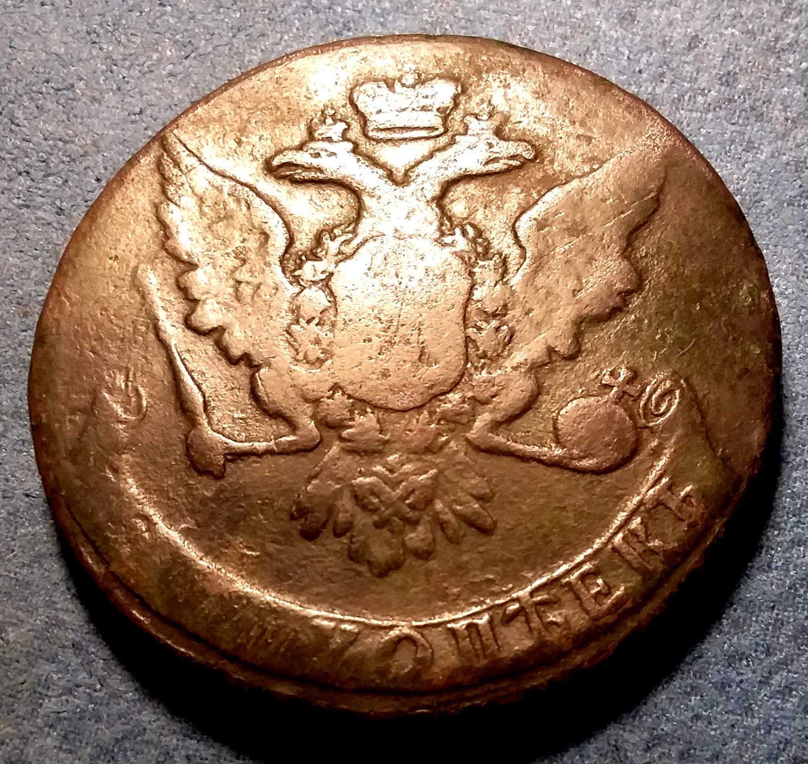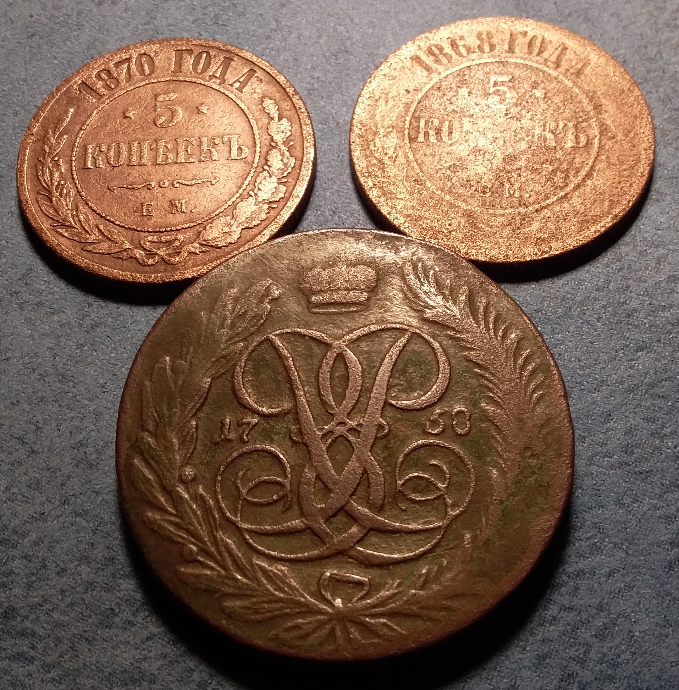 По 2 часа на день дають світло,не встигаю відповісти.Одним словом сьогодні розвязка історії і на жаль не така як я думав.Метрах в 30 від пятаків знайшов ще одну монету і теж 1758 р.Не знаю який номінал,схоже що 1 коп.,тому що 2 коп. в мене є і вона більша.Вони так вдарили,що промазали і частину поля монети не видно.Але видно якої товщини була заготовка і скажу вам кувалда там була не мала.Резюме таке - пятак Елізавети випадково опинився серед пятаків Олександра 2.Скоріш за все там була стежина і монети 1758 року були з одної кишені,а 1868,1870,1880 рр. з другої.Просили другу сторону пятака Елізавети,виставив.