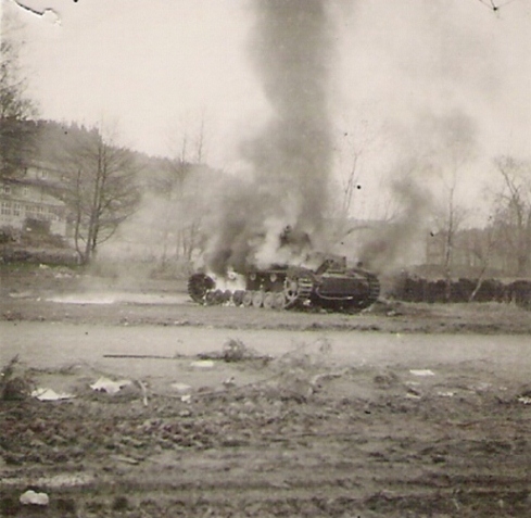 На удивление мало оказывается фото именно горящей бронетехники. Вот попалась еще одна - PzIV. Снимок сделан американской 1-й пехотной дивизией.
