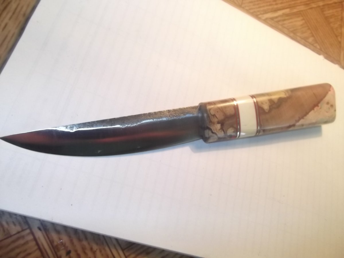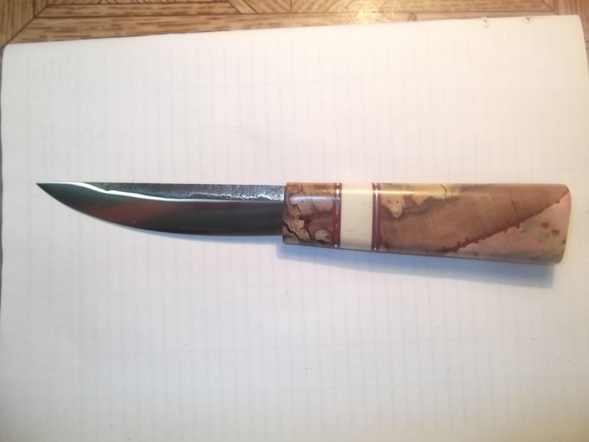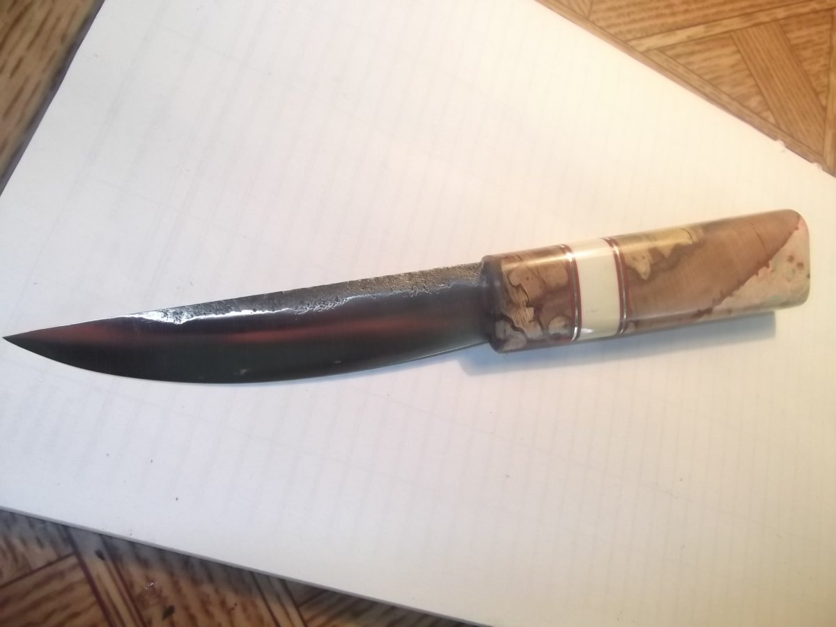 клинок от "Апостол Сашко" сталь ШХ-15 длина клинка - 126 мм ширина клинка -27 мм обух -у основания 3,2 мм рукоятка стабилизированный -гибрид шпальт бука , кап клена ,акрил вставки - мельхиор , рог оленя ,фибра. общая длина рукоятки -125 мм форма - "яйцо" хотелка 1500 гр . оплата на карту П-Б . Отправка за счет покупателя Н-П , интайм ,деливери , Укр пошта +10 гр , возникнут вопросы пишите
