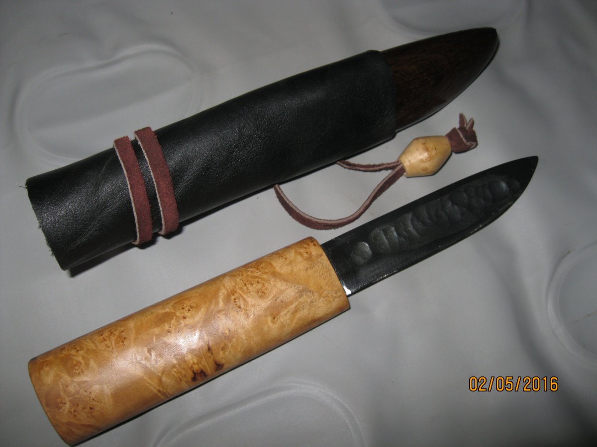 якут,лезвие-сталь 65г,размеры 112*24*3 мм,общая длина 235 мм,рукоять кап клёна,ножны-морённый дуб,кожа.400 гр.