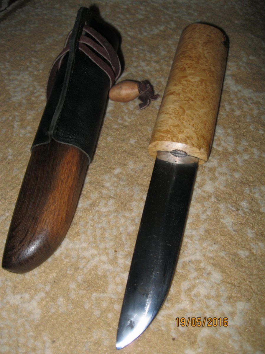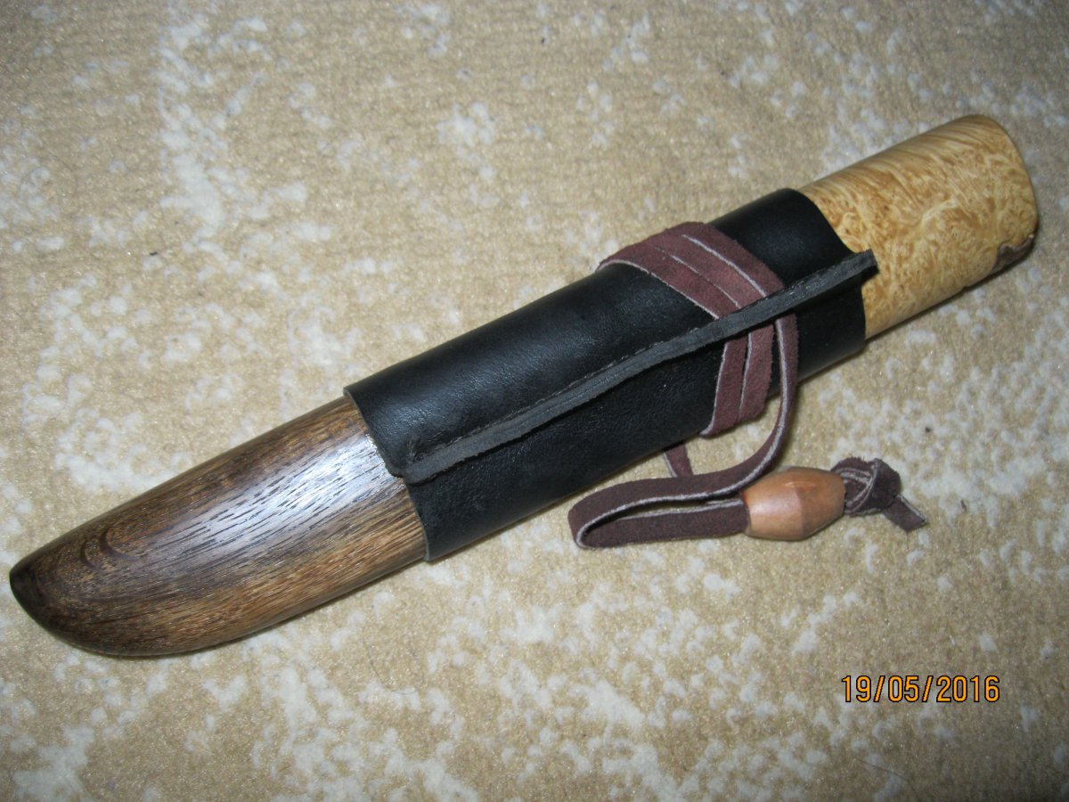 нож якут,лезвие сталь 65Г, 121*27*2 мм.отполирован,заточен,видны следы ковки.рукоять кап клёна,ножны морённый дуб,кожа.400 гр.