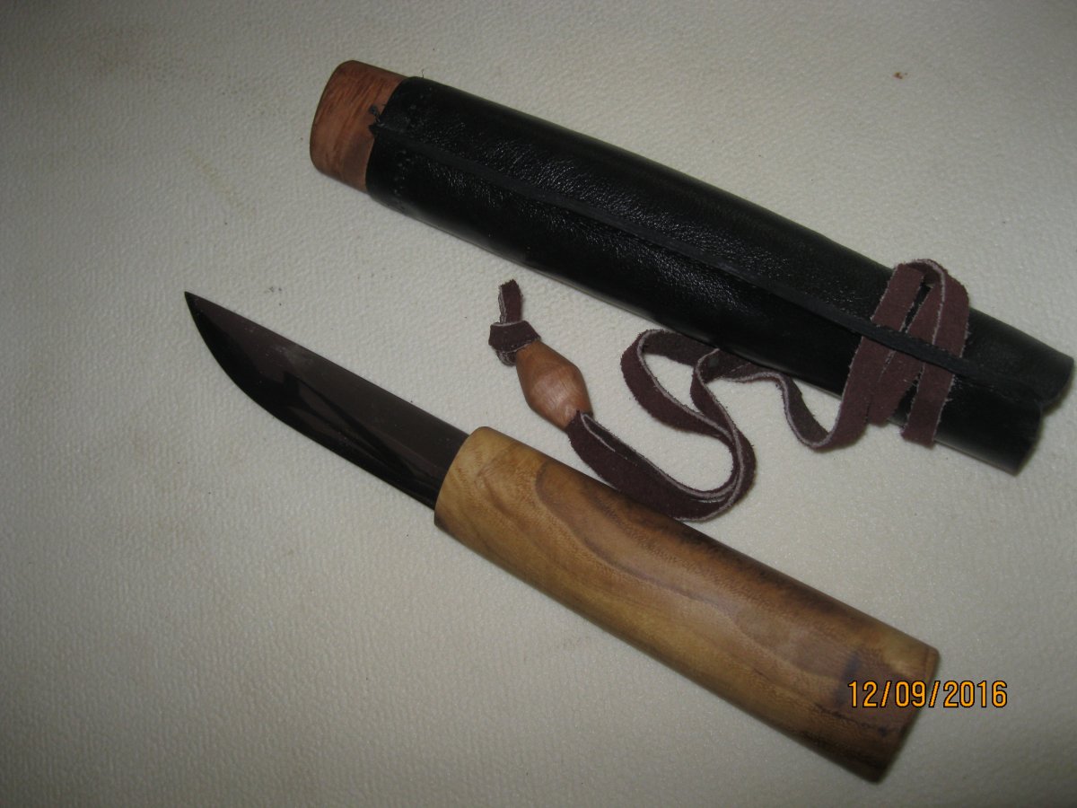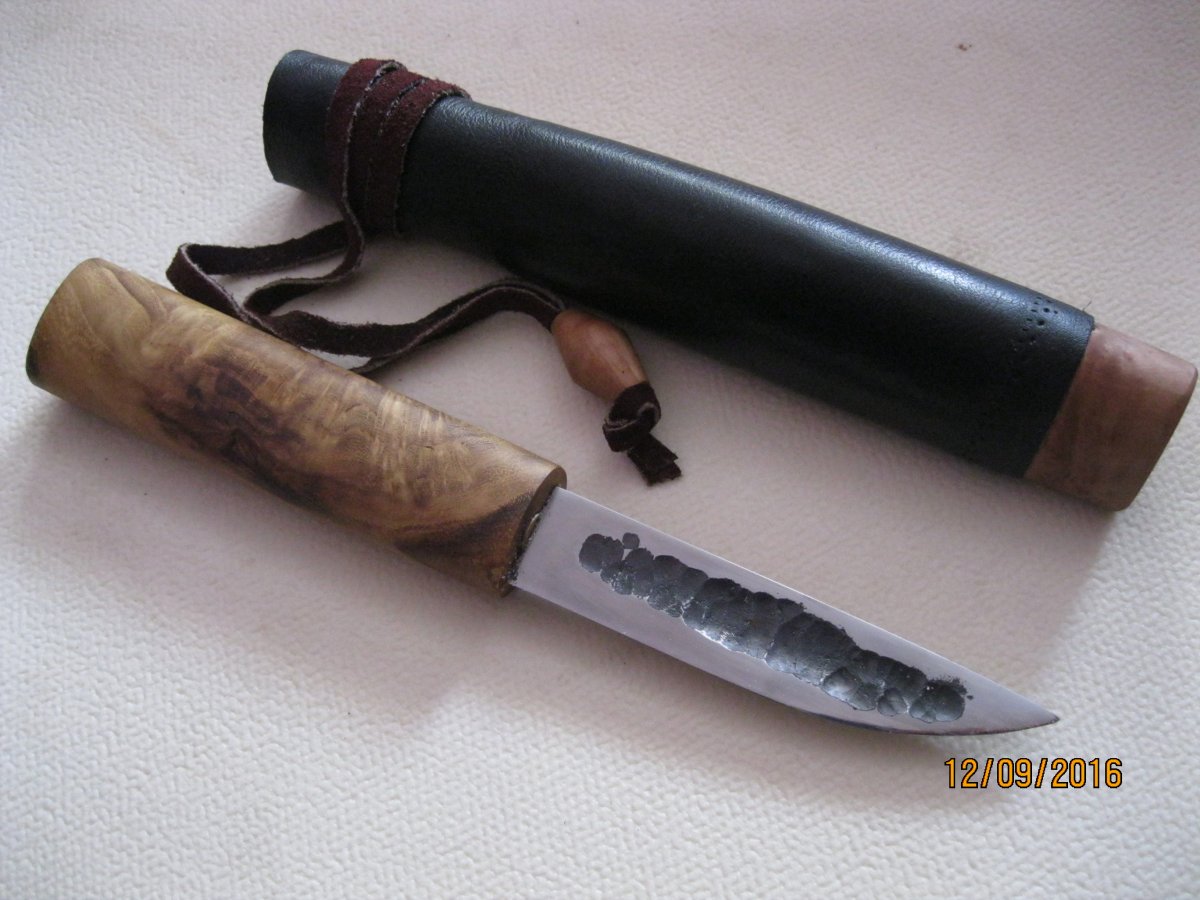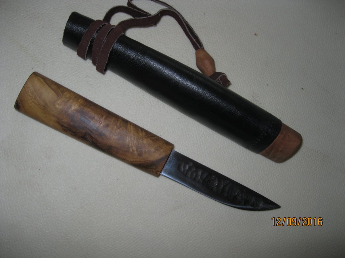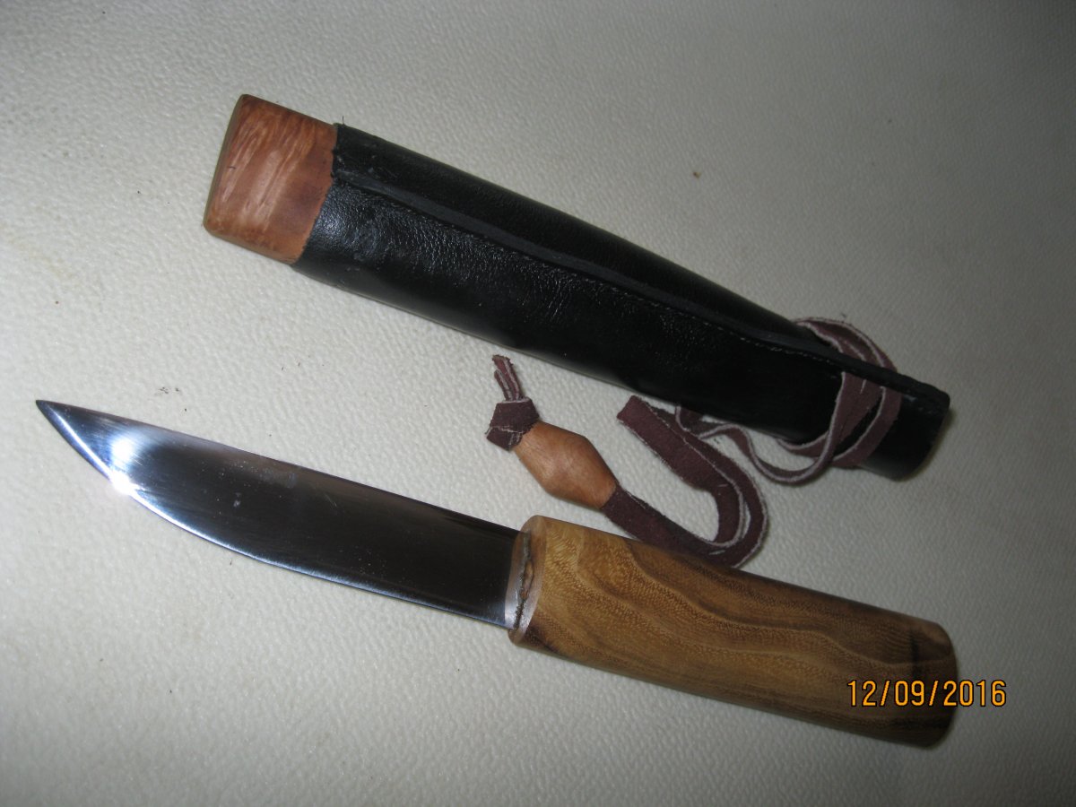 якут.сталь 95Х18 лезвие- длина 105 мм,ширина 23 мм,толщина 3 мм.общая длина ножа 233 мм.рукоять кап акации,ножны кап ольхи+ясень(внутри),кожа. 500 гр.