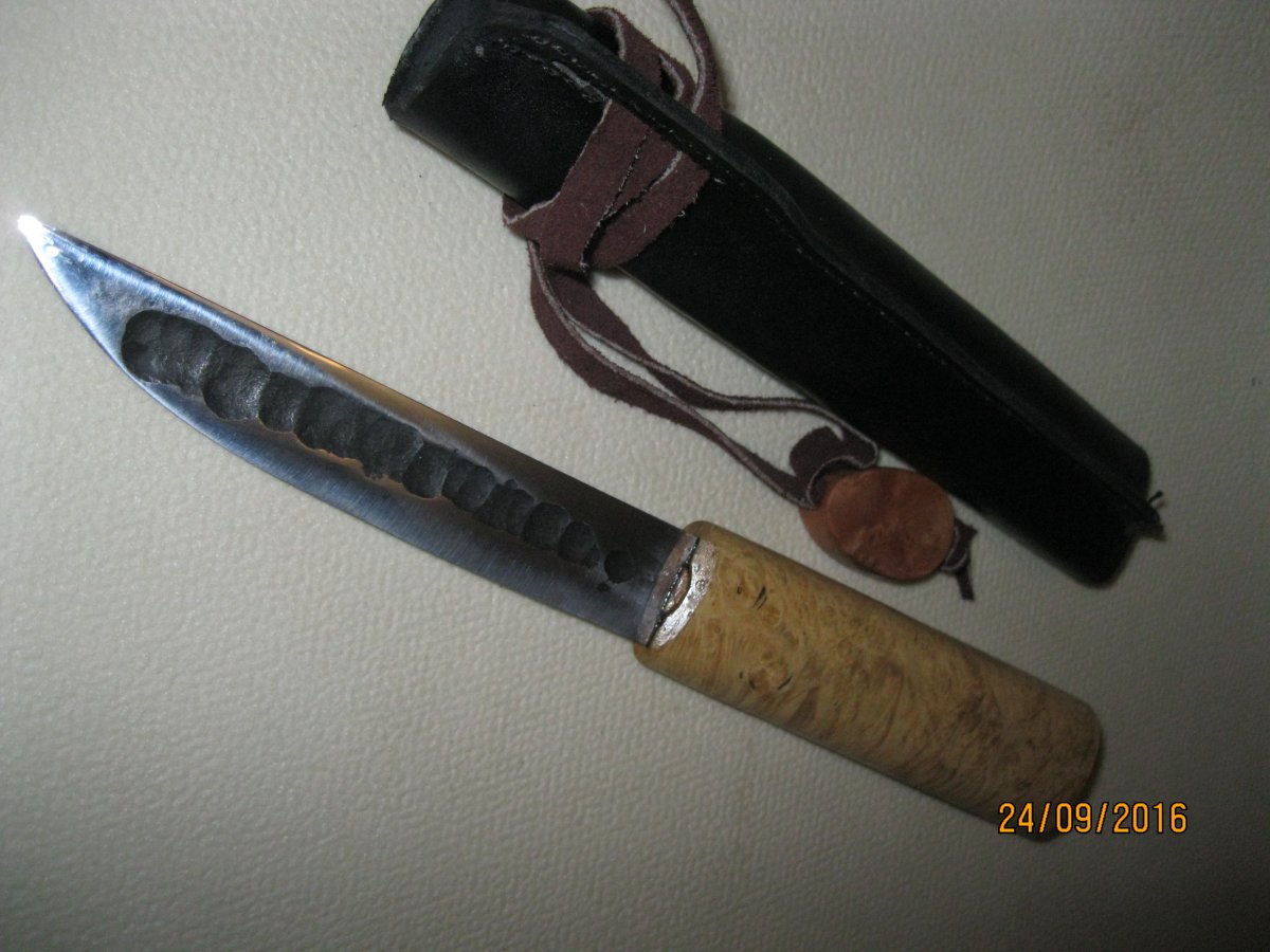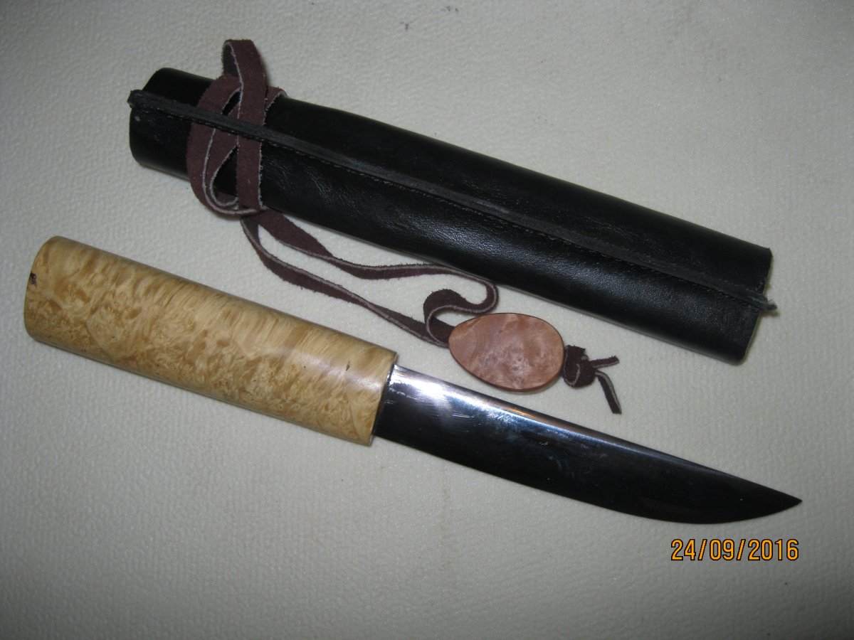 якут.под левую руку.лезвие 133 мм,ширина 23 мм,толщина 3,5 мм.общая длина ножа 250 мм.рукоять кап клёна,ножны ясень,кожа.цена свободная.