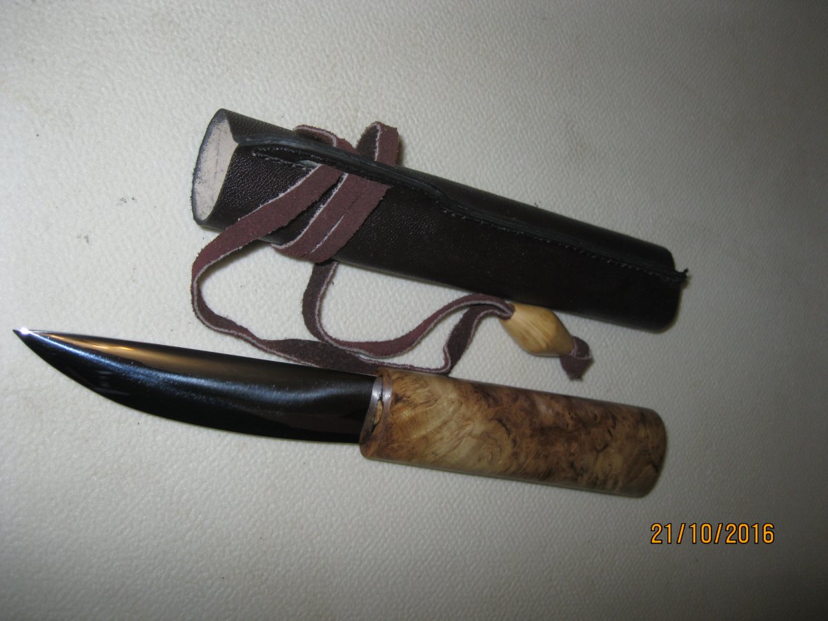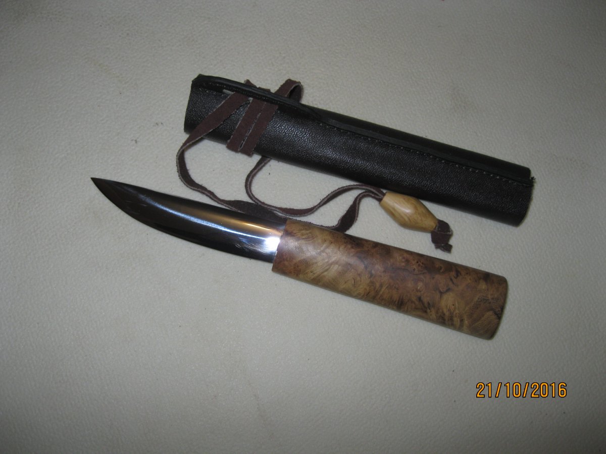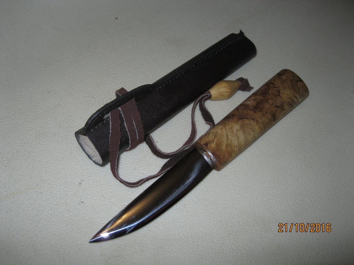 якут.сталь 95Х18 длина лезвия 112 мм,ширина 23 мм,толщина 3,5 мм.общая длина ножа 236 мм.рукоять кап акации,ножны кап ольхи,кожа. 500 гр.