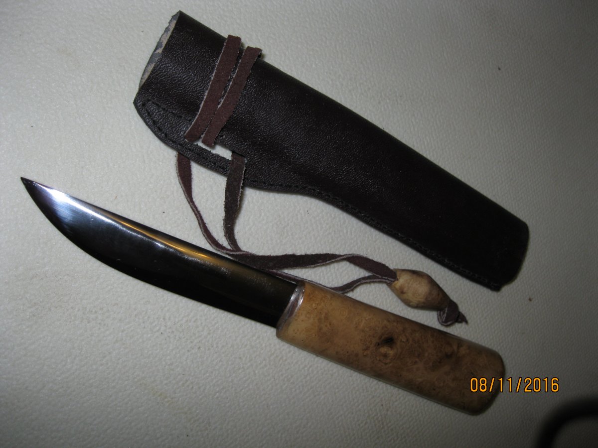 якут.сталь 95Х18 лезвие длина 126 мм,ширина 22 мм,толщина 3,5 мм.общая длина ножа 245 мм.рукоять кап акации,ножны ольха,кожа. 500 гр.
