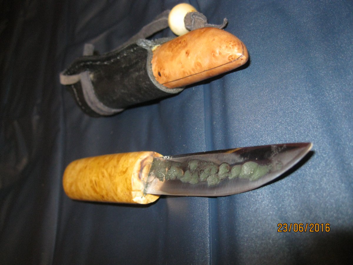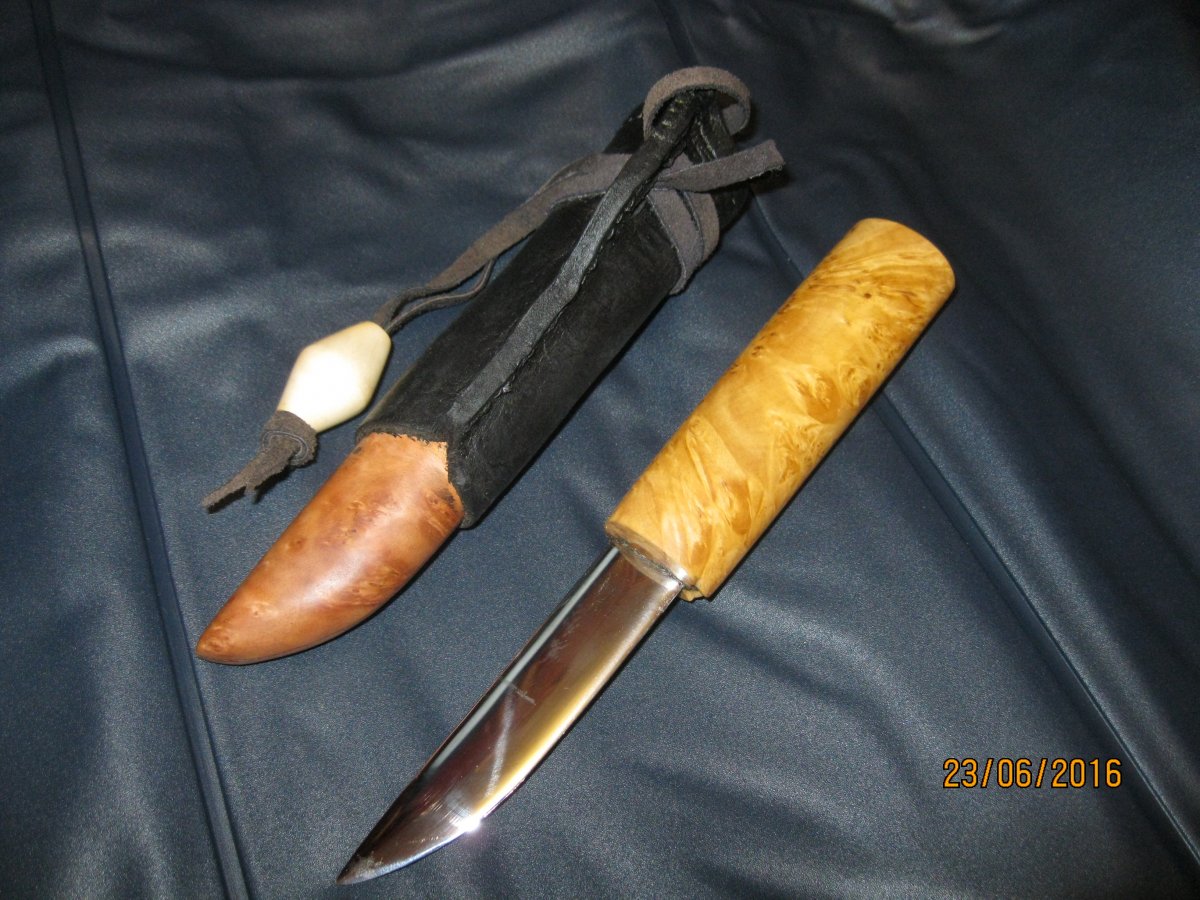нож якут,лезвие 95х18. 90*19*3 мм.общая длина ножа 190 мм.длина с ножнами 203 мм.(для правши)рукоять кап клёна,ножны кап ольхи,кожа.