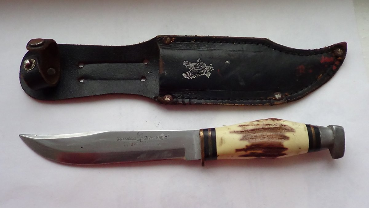 Рукоять-рог, ножны-кожа. Клинок- нержавейка 440С.