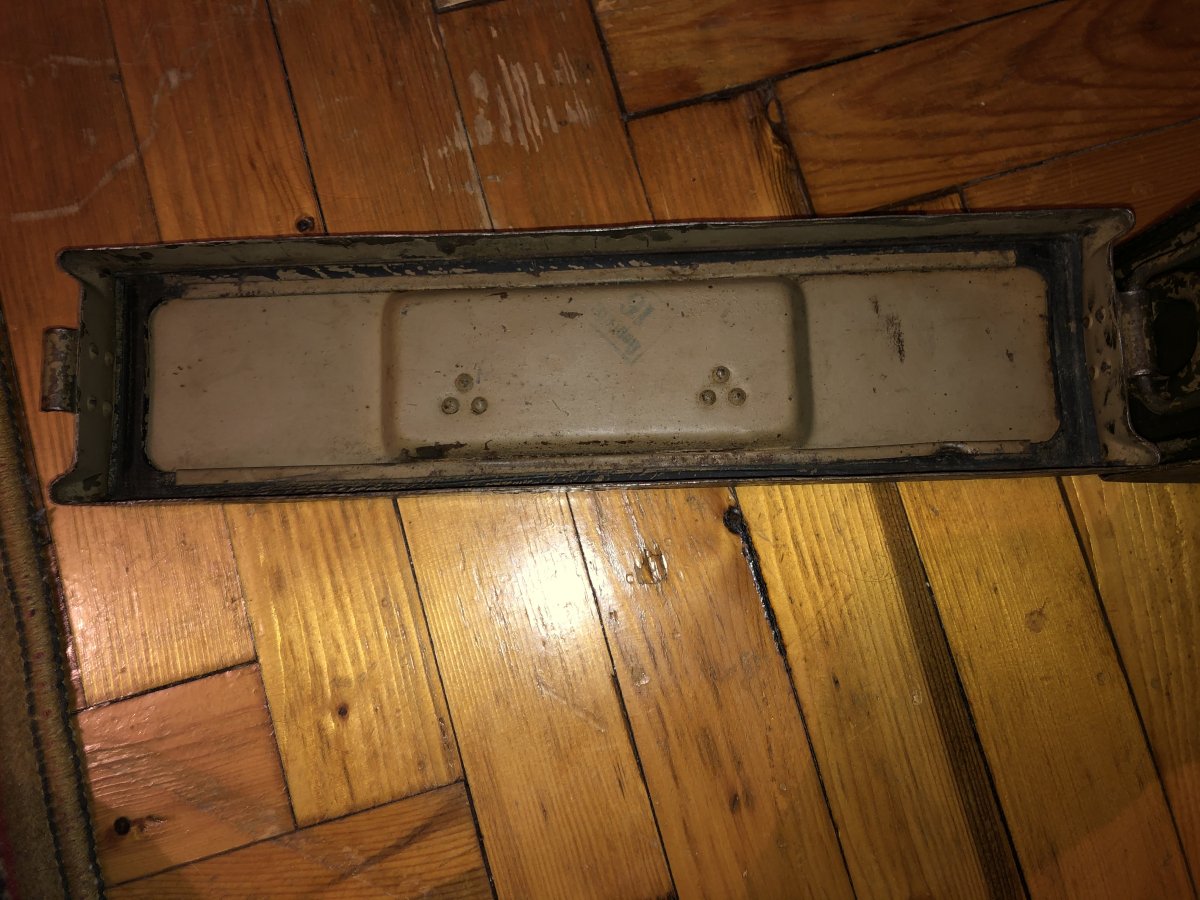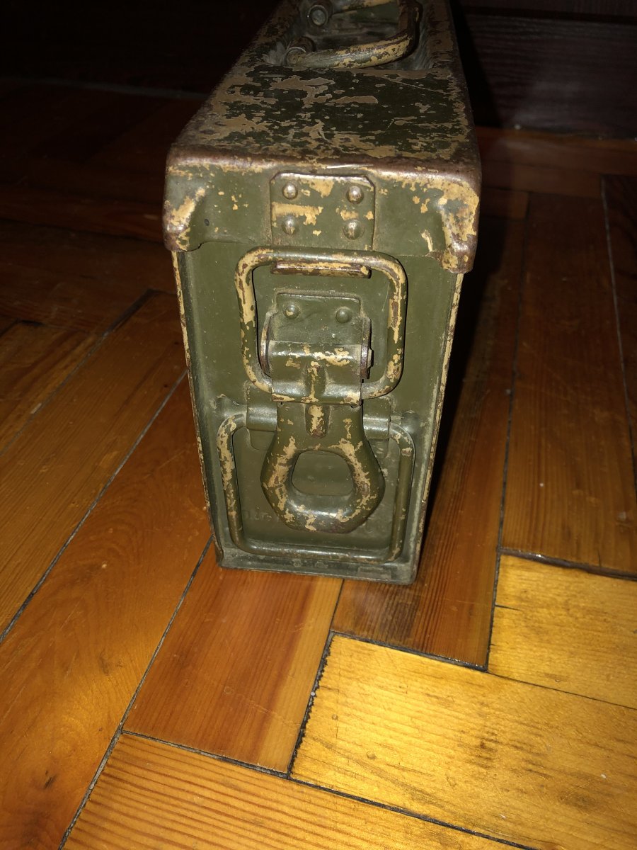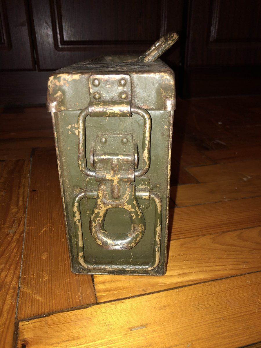 Поправлю - ориентировочно с 41-го. Эта модель патронных ящиков появилась в 41 году (на боку - "патроненкастен 41 фюр машиненгевер") А год выпуска можно посмотреть под ручкой на крышке. Там еще и мастичная печать проглядывается на родном окрасе.