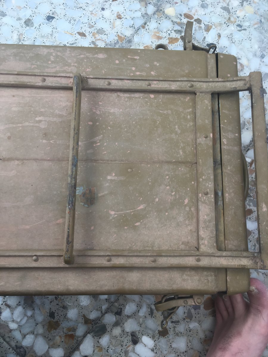 Вот и сказалась близость Африки. Ящик - в песочном окрасе. Перекрас из фельдграу, в царапинах проступает. Искать клеймо приемки - значит, снимать краску. След от шильдьІ контуром еле видно, думаю когда красили - оторвали. Джекпот вобщем. МьІть стремно,часть краски отходит, немного посьІпаться может. Но придется. Фотал пока телефоном.