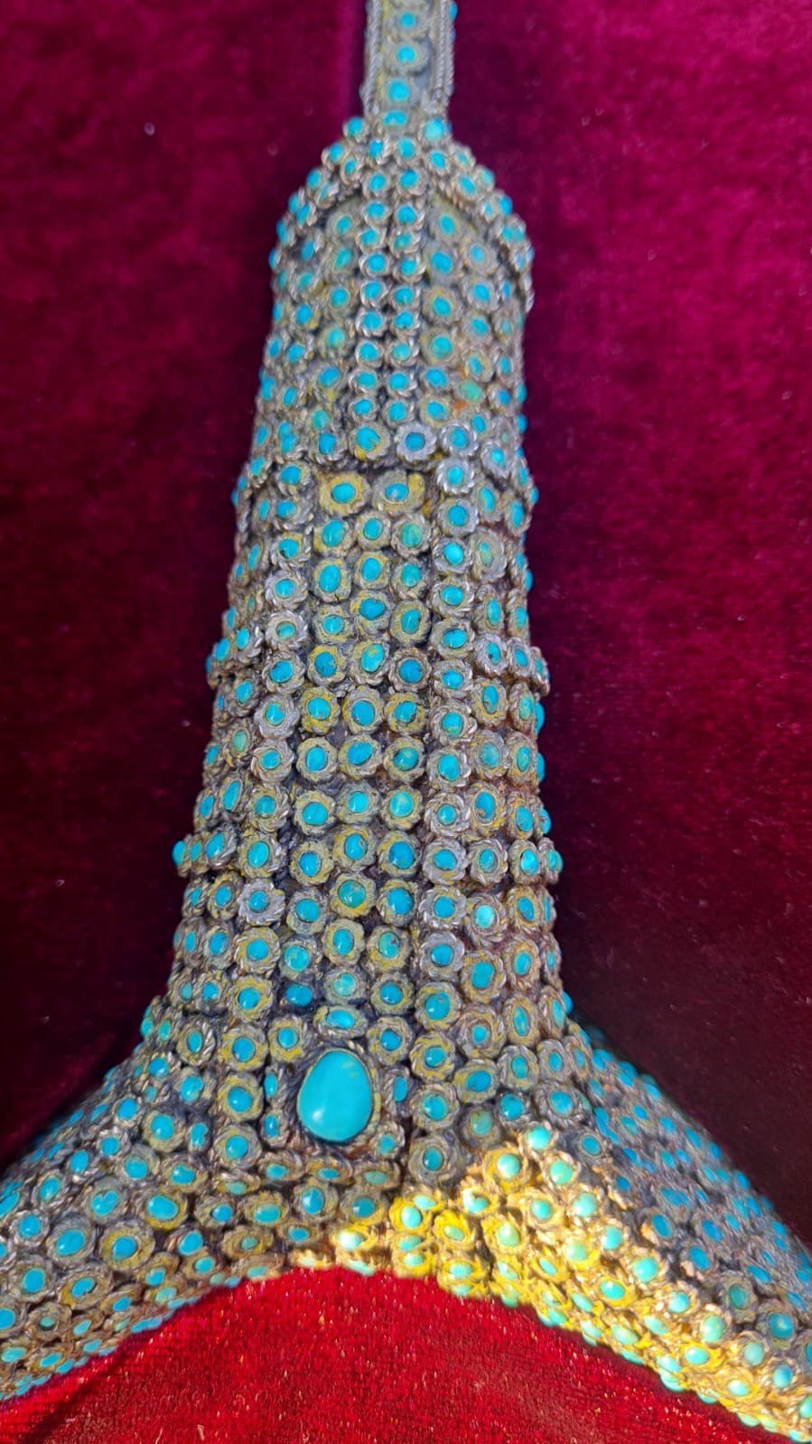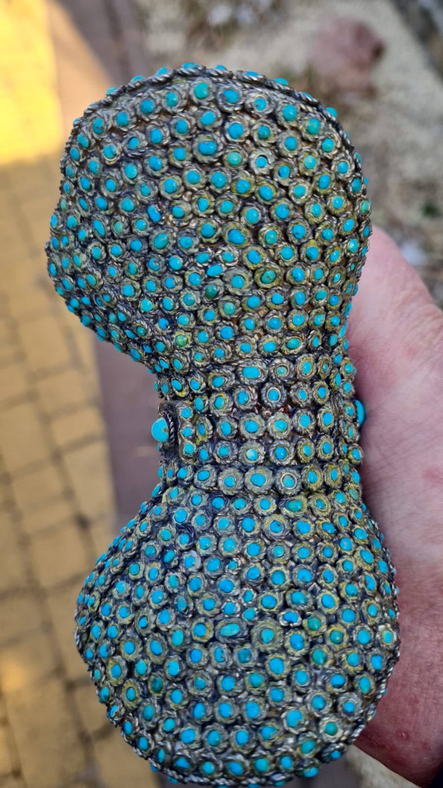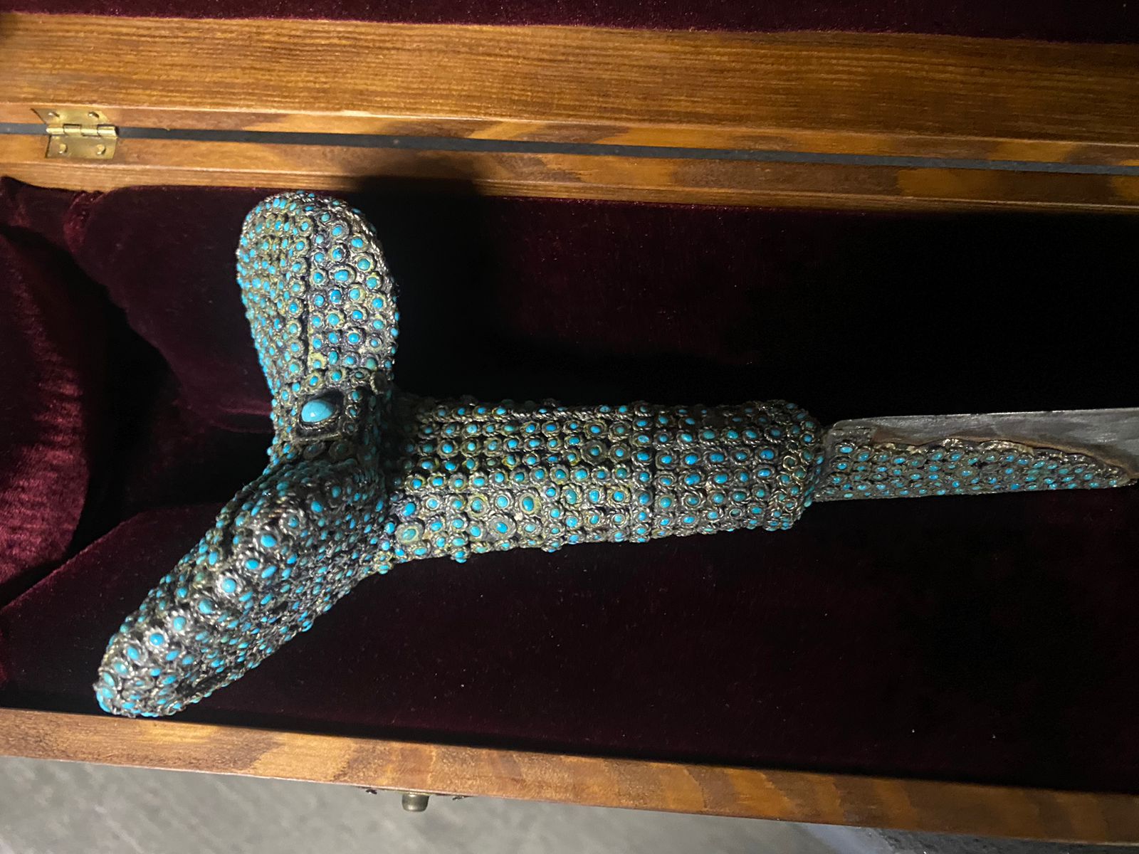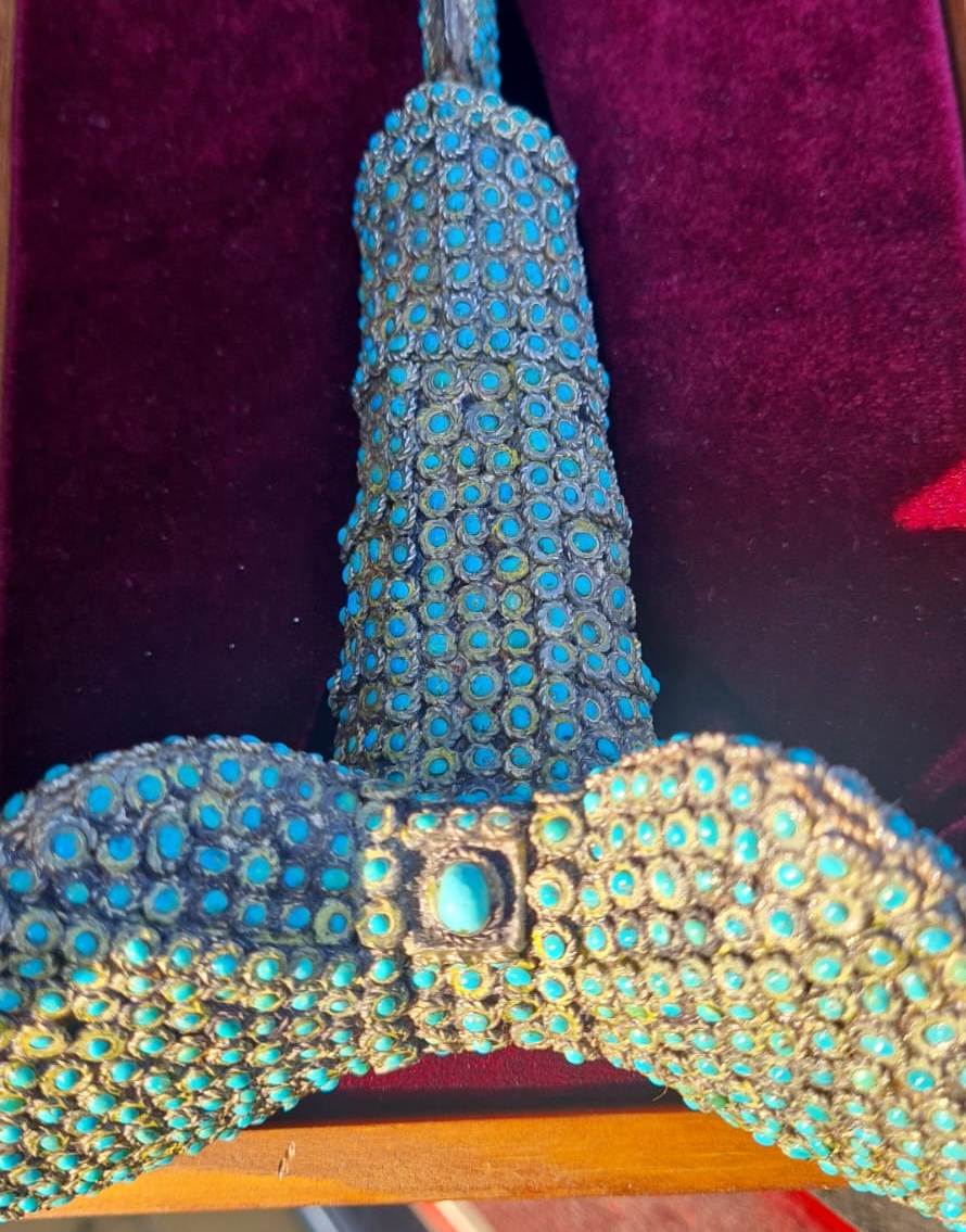 З відкіля така упевнненість? Скажить що робить така кількість самої дешевоі бірюзи (мислю що китайска) на цьому предметі? Через мої руки проходили колись ятагани 19ст.,алеж как заправило клинки були таушировані, чи якось прикрашені, ніколи не бачив просто тупо іржавого клинка без якихось прикрас на ятогані.Рукоять теж нісхожа ні за формою,ні за звичайним матеріалом, тобто рог буйвола, чи кість.Ні якої патіни на філігрінному серебрі теж немає,як це так може бути на серебрі 19ст.?