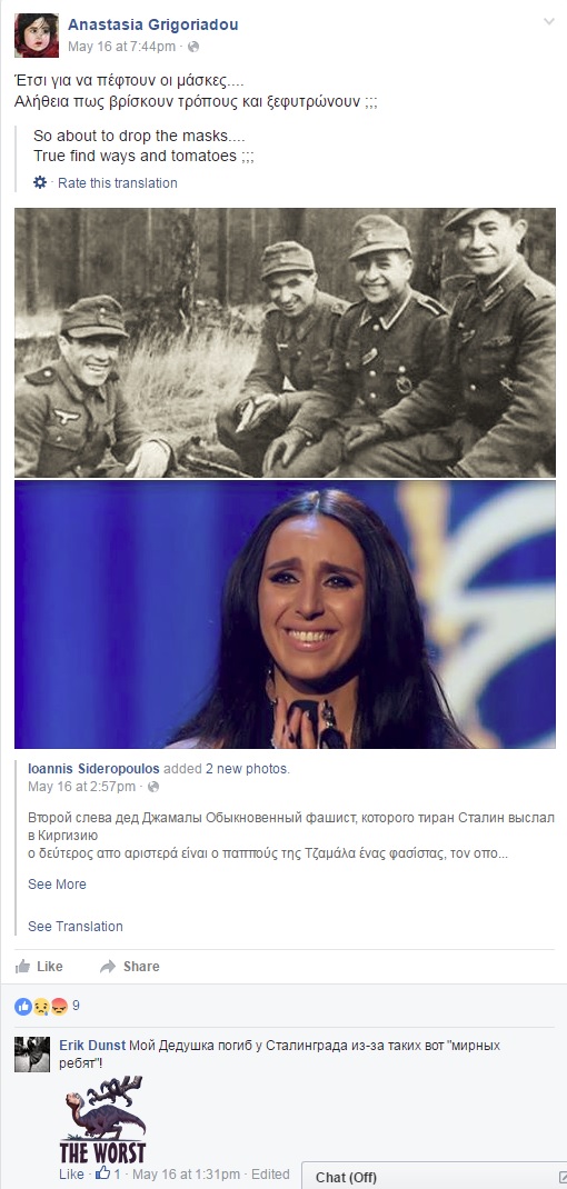 Великі народи вміють програвати. Як і сподівалося - Росія почала лити бруд на Джамалу як тільки вона виграла. Ось зразок кацапо-бота що відповідає а Грецький сегмент фейсбуку - фотка з Азербайджанським легіонером - тіпа це дідусь Джамали: П.С. Внизу коментарії того самого троля, з його запасного профіля
